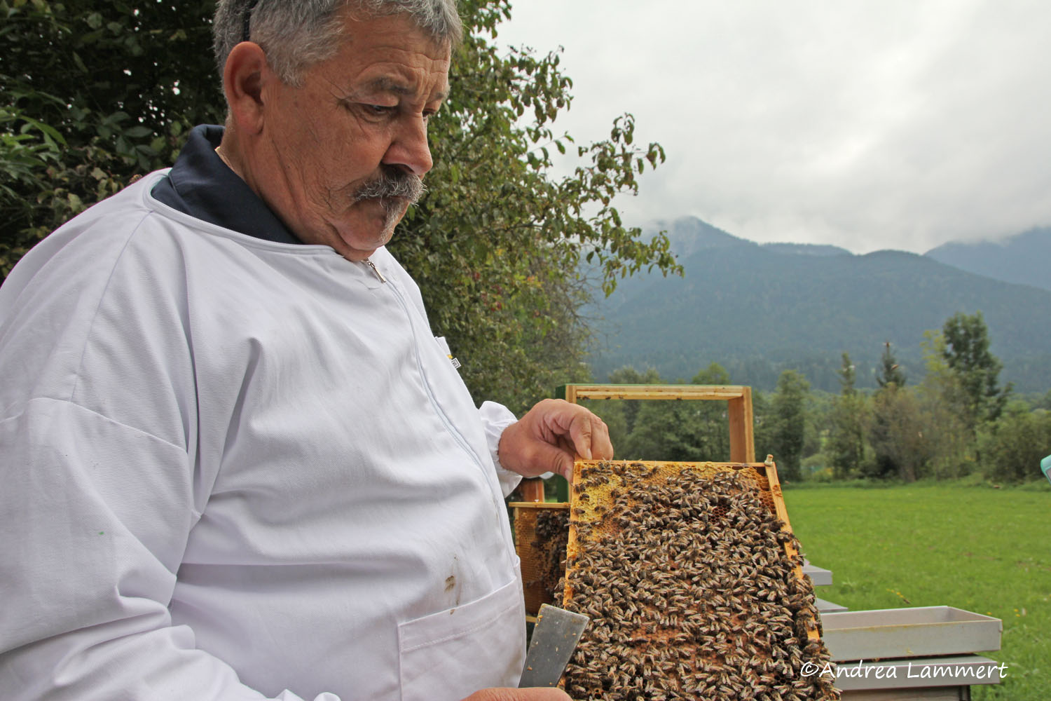Ich liebe Bienen und könnte ihnen stundenlang zuschauen. Doch leider sind diese Begegnungen auch immer mit Respekt verbunden, seitdem meine Imkererfahrungen im vorletzten Jahr nicht so gut geendet sind. Umsomehr habe ich mich also auf den Besuch bei Herbert Zwischenbrugger gefreut, der für uns seine Kästen öffnet und uns mehr zu den Kärntener Bienen im Gailtal erzählt. Er hat dieses Blitzen in den Augen, als er uns begrüßt und von seinen Bienen erzählt. Das Blitzen eines Menschen, der aufgeht in dem, was er tut.