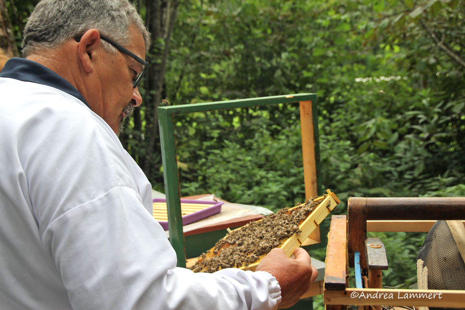 Dass sie so sanftmütig ist, erfahren wir gleich, denn Zwischenbrugger lässt uns in seinen Imkeralltag hineinschauen. Er hat in allen Kästen die Königin mit einem Punkt markiert, nur in einer Beute hat er sie noch nicht gefunden. Diese Beute öffnet er jetzt – ohne Netz oder Imkerhut. Auch wir stehen sehr nah an den Beuten – ohne Stichschutz. Zwischenbrugger nimmt gekonnt Rähmchen für Rähmchen aus den Holzkästen und sucht. Zwischen den tausenden von Bienen muss irgendwo die Königin sein. Nach einigen Versuchen hat er sie gefunden und greift sie vorsichtig mit bloßen Händen.