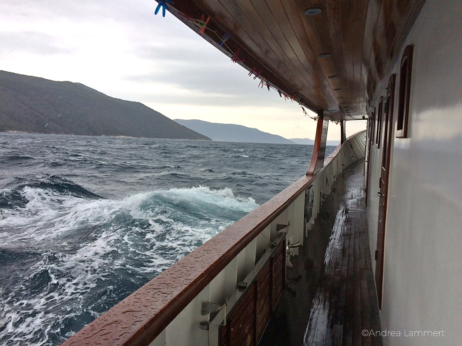 Er meint gar nicht den Jugo, der uns hier zwei Tage frieren lässt, sondern spricht vom Radfahren allgemein: „Ich mag den Wind nicht. Er kommt irgendwie immer von vorn. Und wenn man sich auf den Rückenwind zur Rückfahrt freut, dann schlägt er einem ein Schnippchen, hat gedreht und kommt wieder von vorn.“ Ja, leider muss ich ihm da irgendwie zustimmen. Heute aber ist der Wind besonders unfreundlich zu uns, denn er wühlt die Adria so dermaßen auf, dass unser Schiff nicht nur schwer voran kommt, sondern auch beachtlich schwankt. Eigentlich habe ich keine Probleme mit Seekrankheit und es ist auch alles gut – bis ich kurz in die Kabine gehe und beinahe von einer Wand zur anderen geschmissen werde. Ad hoc wird mir schlecht.