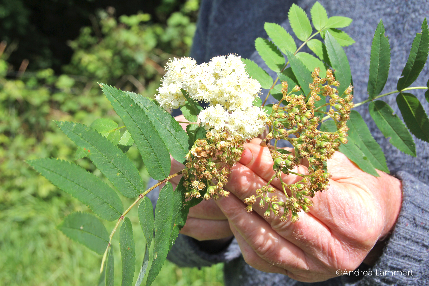 Als nächstes pflückt Robert eine Pflanze, deren großer Bruder bei uns etwas in Verruf gekommen ist: Bärenklau. Doch der Wiesenbärenklau ist eine uralte Heilpflanze und nicht zu vergleichen oder gar zu verwechseln mit dem Riesen-Bärenklau. „Die Blüte esse ich wie Brokkoli, die grünen Samen schmecken wie Kardamom“, weiß Mary White und erzählt, dass sie aus den Samen gerne Kekse fertigt. Sie erzählt mir im Vorbeigehen, dass es 100 Sorten Löwenzahn gibt und dass sie Kiefernnadeln in Öl einlegt und als Spezialität verzehrt. Aus den Samen der Eschen macht sie Pickles und Nelkenwurz benutzt sie als Gewürz in der Kürche. Sie pflückt ein Blatt Weißdorn und sagt: „Weißdorn ist der Feenbaum. Er wird bei uns sehr verehrt. Blätter, Blüten und Früchte sind gut für das Herz.“