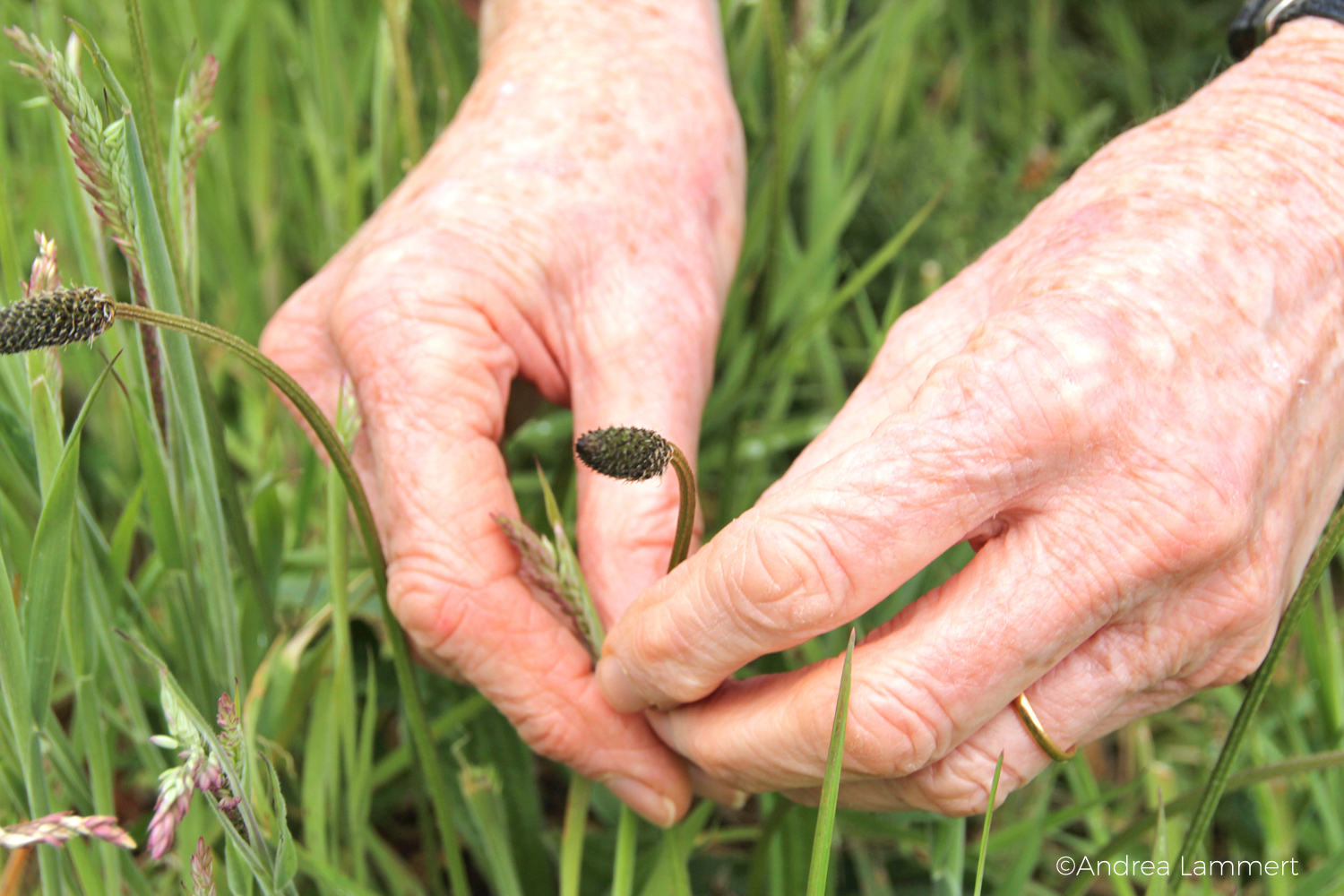 Mary White kommt nicht weit. Sie hält schon mitten im Gras an und beugt sich zum Spitzwegerich herunter. Dass man aus den Blättern einen Hustensaft machen kann, weiß ich schon, sie aber weiß natürlich wieder mehr und pflückt eine Blüte: „Probier mal und sage mir, wonach es schmeckt“, fordert sie mich auf. Langsam lasse ich diese Ähre in meinem Mund zergehen und überlege.
