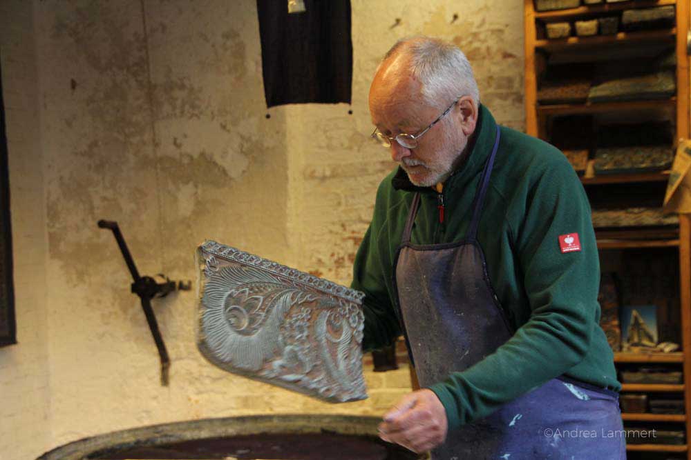 Drinnen ist Blau die vorherrschende Farbe. Georg Stark färbt ganz traditionell mit Indigo, der Färbepflanze aus Indien. Seine Technik ist schon 300 Jahre alt, die Modeln, so heißen die Druckschablonen, sind alles Originale mit Mustern der vergangenen 300 Jahre. Er ist mit seiner Werkstatt immaterielles Uneso-Weltkulturerbe und färbt nicht nur Tücher und Schürzen, sondern ganze Stoffbahnen mit den alten Mustern. Ein lebendiges Museum ist es, in dem der Blaudruckmeister einfach weiterarbeitet und sich dabei über die Schultern schauen lässt. (Kattrepel 3, Mo-Fr 11-17, Sa 10-14 Uhr, www.blaudruckerei.de).