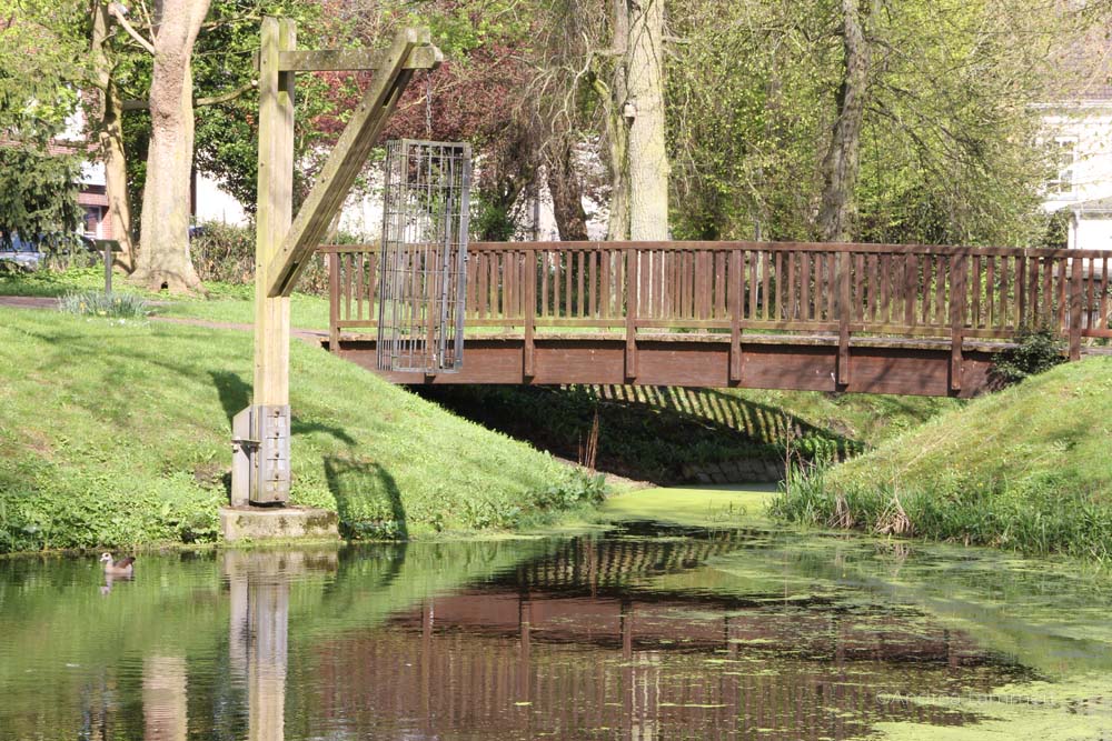 Grachten, hier Graften genannt, ziehen sich entlang der Innenstadt. Ein menschengroßer Käfig hängt über dem Wasser inmitten der grünen Idylle zwischen gebogener Brücke und mit Entengrütze übersätem Wasser. Was dort wohl passiert ist?