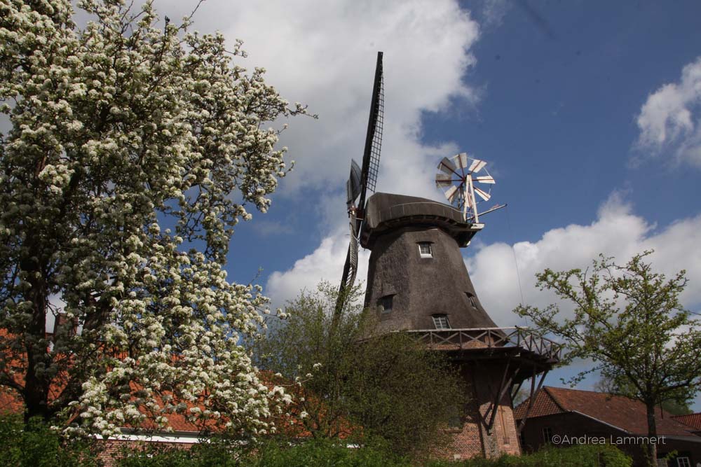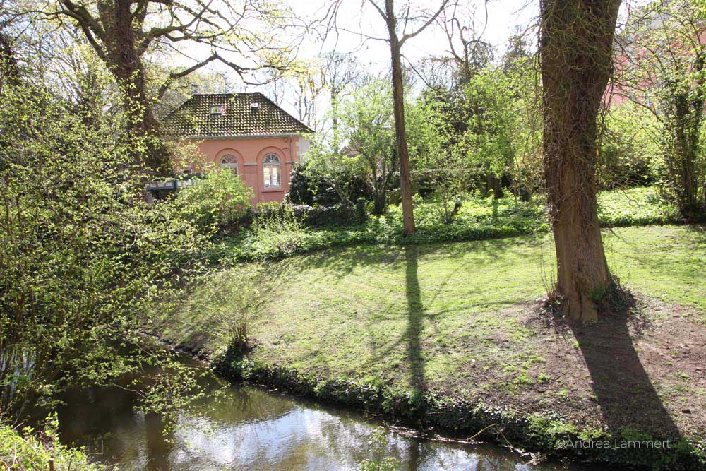 Es ist ein Wüppgalgen, lese ich später im Stadtführer von Jever. Dieser Käfig wurde im Mittelalter unter anderem dafür gebraucht, um angeklagte Hexen zu bestrafen. Sie wurden in diesen Käfig gesperrt und je nach Ermessen des Richters für eine gewisse Zeit ins Wasser eingetaucht, manchmal bis zum Ertrinken. Da ich schon in Lemgo genug grausame Hexengeschichten gelesen hatte, suchte ich mir lieber den Weg weiter zum Alten Markt. Der Weg führt vorbei am Schloss, dessen Bäume in herrlichster Blüte stehen. Magnolien sind weit geöffnet, Zierkirschen lassen rosa Blütenblätter regnen und in den Baumkronen krächzen die Krähen, sie sind inoffizielles Wahrzeichen von Jever.