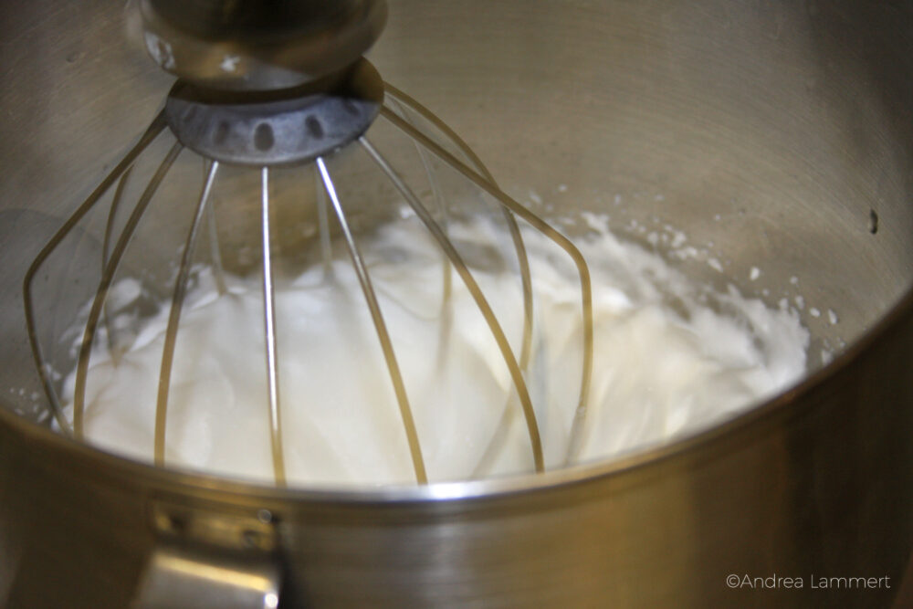 Bevor es ganz steif ist, Zucker einrieseln lassen und kurz weiterschlagen.