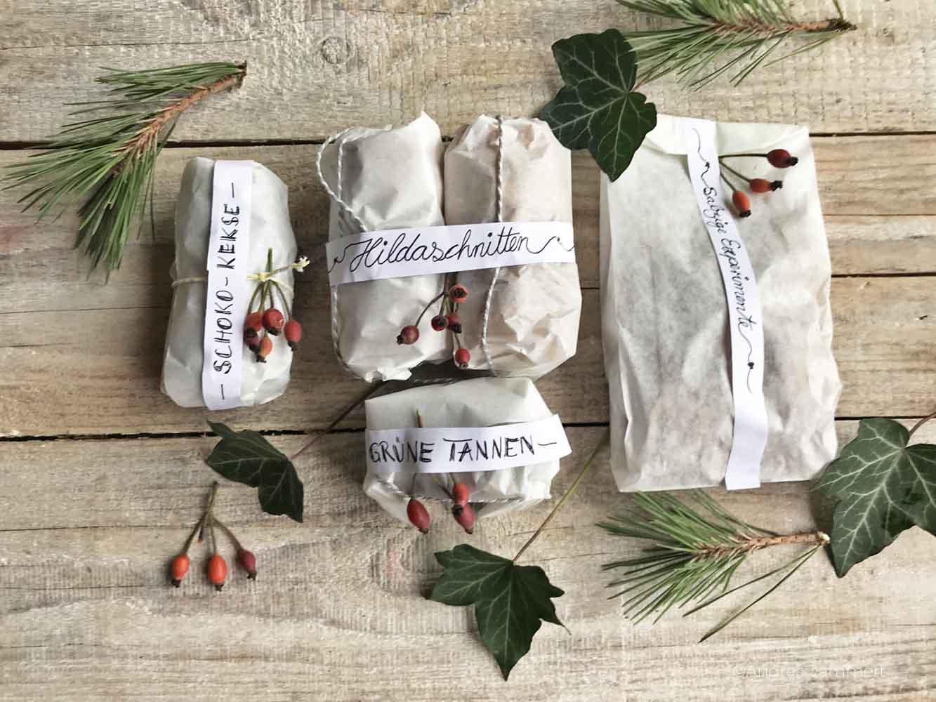 Ich habe lange überlegt, wie ich die Weihnachtsplätzchen umweltfreundlich und hübsch verpacken kann. Dann fiel mir das Butterbrotpapier in die Hände, das wir zum Sternebasteln benutzt hatten und plötzlich kam mir die Idee: ich wickele jede Kekssorte in Rollen, verknote sie mit Juteband und beschrifte sie mit Papieretiketten. Das sieht dann fast so aus, als kämen sie aus der Konditorei. Frisch gelabelt. So schön sahen meine Weihnachtskekse noch nie aus.