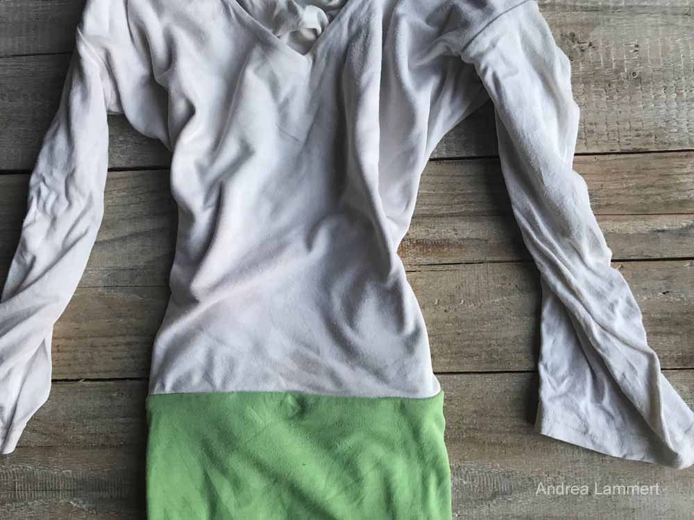 Manchmal ist das Top zu lang, zu weit oder irgendwie nicht passend. Ich schneide sie dann in der Mitte durch, schneide ein passendes Stück Stoff zu und setze es als Verlängerung ein. Meistens ist es ein weiteres T-Shirt, das nicht mehr passt oder zu kurz geworden ist. So lassen sich aus Tops und T-Shirts Kleider machen.