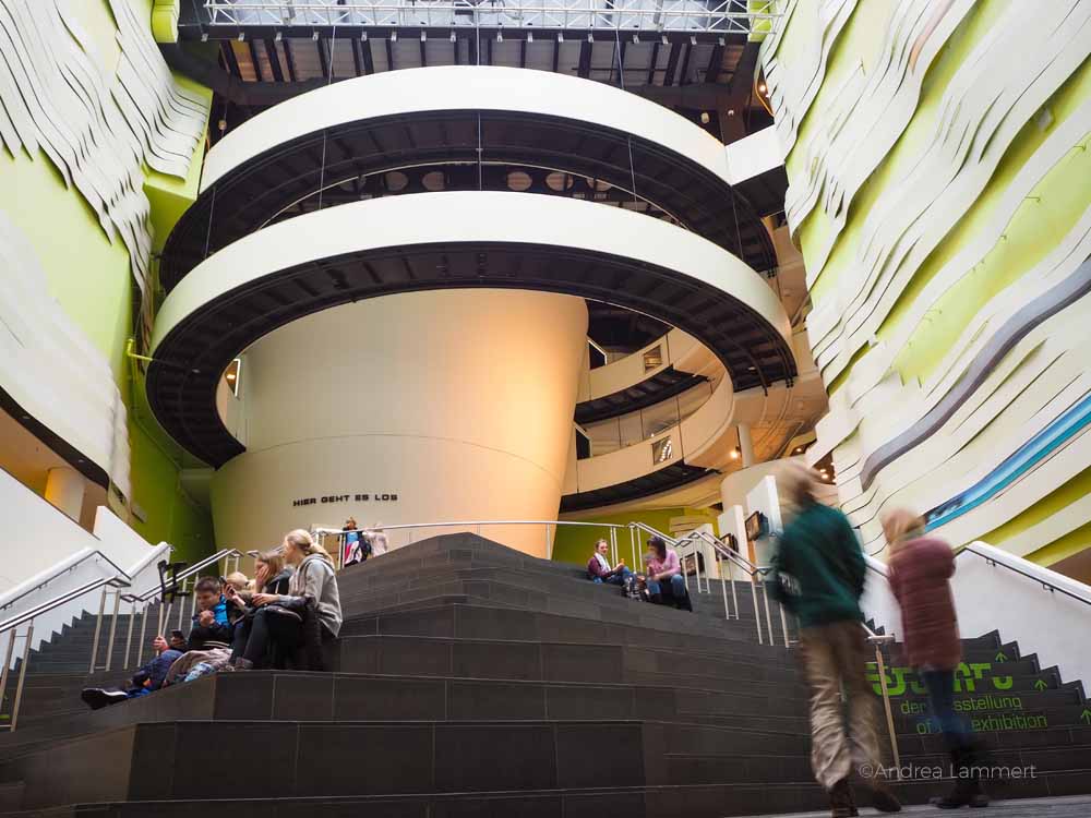 Mein Sohn hatte dieses erwartungsfrohe Glitzern in den Augen und meine Tochter war stolz auf ihren Reisepass, den sie am Eingang anstatt der Eintrittskarte in die Hand gedrückt bekam. Schon das Foyer des Museums ist beeindruckend mit seiner riesigen Höhe, der futuristischen Architektur und den gigantischen Ausmaßen. Doch wo geht es eigentlich rein? Wir fanden den Eingang nicht sofort, denn wer ins Klimahaus gehen möchte, muss zunächst ein Kino passieren und das hat seinen Grund.