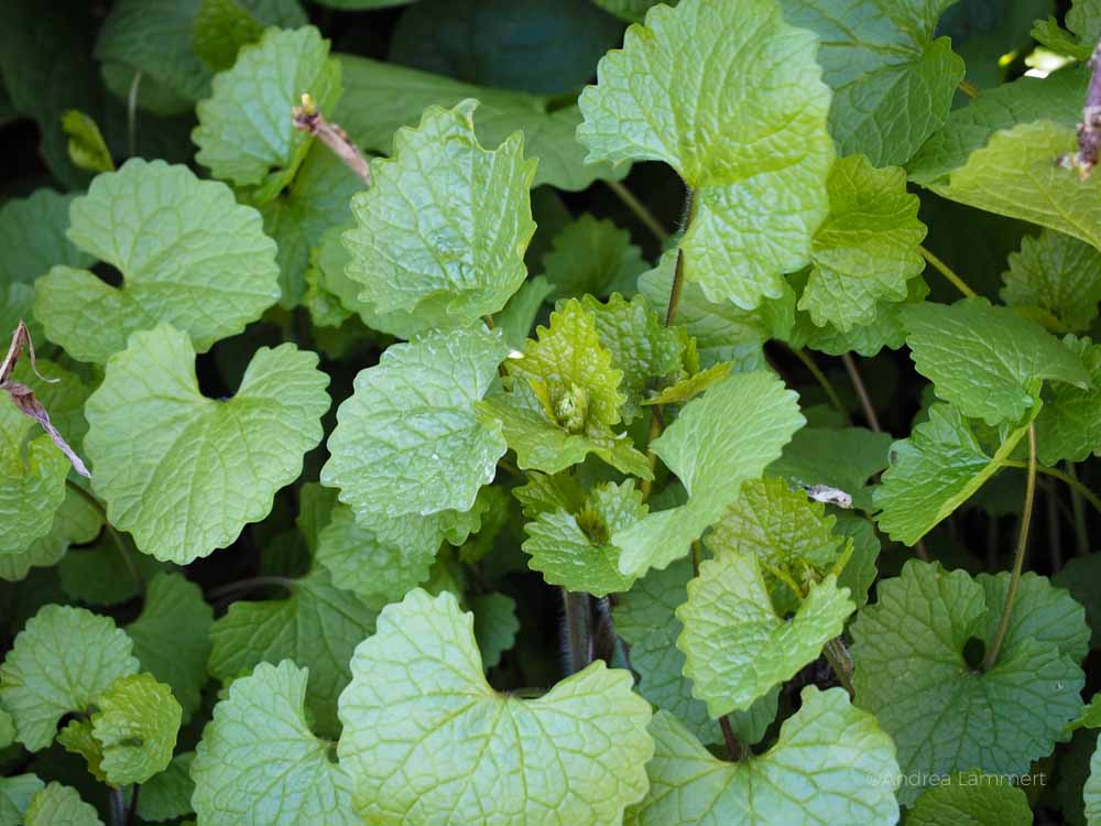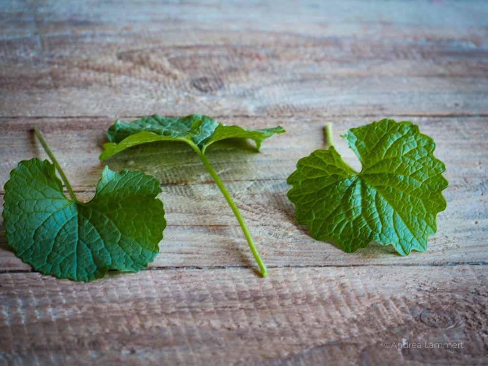 Sie wächst überall, am liebsten jedoch am Rand, also an Zäunen, zu Fuße von anderen Pfanzen, gerne unter älteren Bäumen, denn sie mag gleißendes Licht nicht so. Sie hat geriffelte, herzförmige Blätter, die jetzt im frischen Grün erstrahlen. Das Erkennungszeichen von Knoblauchrauke ist: Wenn man die Blätter reibt, riechen sie typisch nach Knoblauch. Vor allem die jungen Blätter lassen sich gut und gleich vom Busch ernten. Die Pflanze hat weißliche Blütenstände und produziert längliche Samenkapseln. Ich mag übrigens die Samenkapseln fast noch lieber als die Blätter, sie schmecken ähnlich wie Senf.