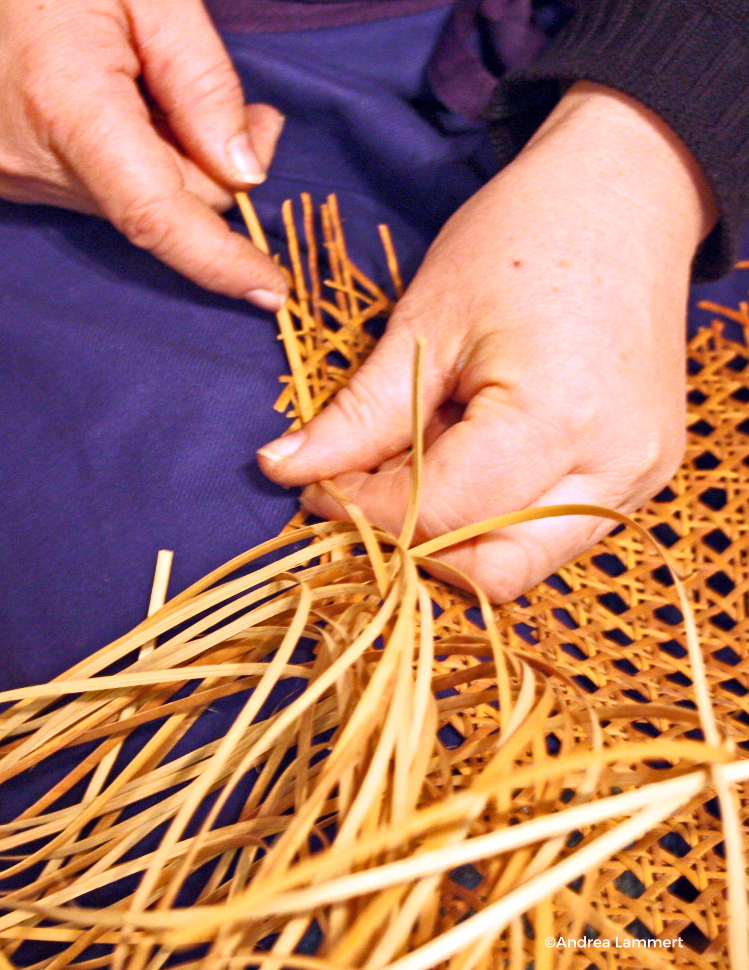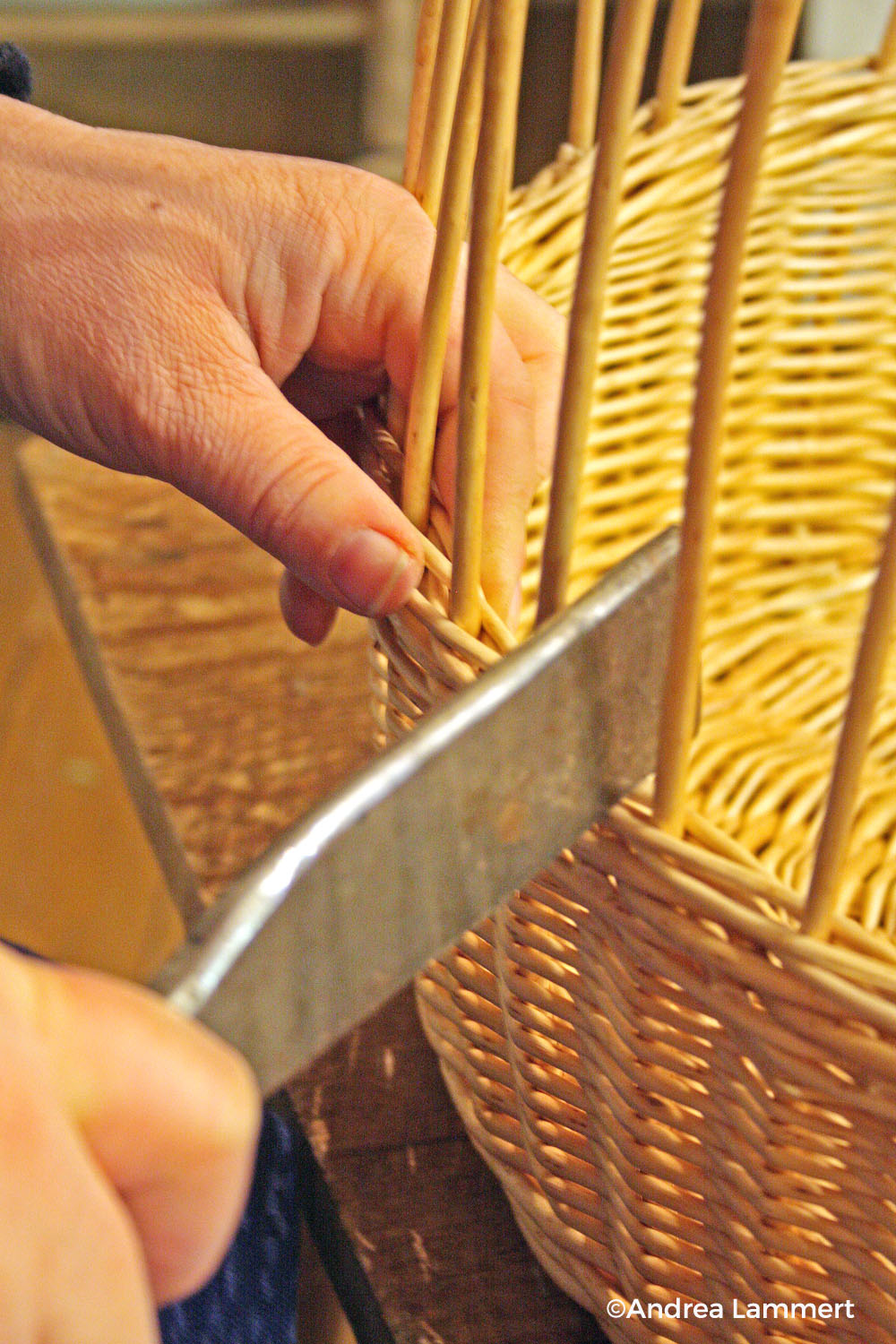 Während sie ihre Rattanrute über das Geflecht legt und kunstvoll rechts und links um das Gerüst schlingt, erzählt sie gern über ihren Beruf, der hierzulande selten geworden ist. In den 60er Jahren verdrängten bunte und leichte Körbe aus Plastik die schweren handgemachten aus Weidenrute. Fabrik gefertigte Plastikprodukte waren haltbarer und auch günstiger als die handgemachten. Eine Tradition drohte zu sterben. Dalhausen im Winter glich damals einem Lager von Reisigbündeln. Die während der Saftruhe im geschnittenen Zweige standen bis zum Mai in der Bever. Frisch geschnitten löst sich die Rinde nicht, die Zweige müssen erst Wasser ziehen. „Nur für einen kurzen Zeitraum geht die Rinde so leicht ab. Verpasst man den, kann man die Weiden nicht mehr schälen“, weiß Ursula Butterweck.