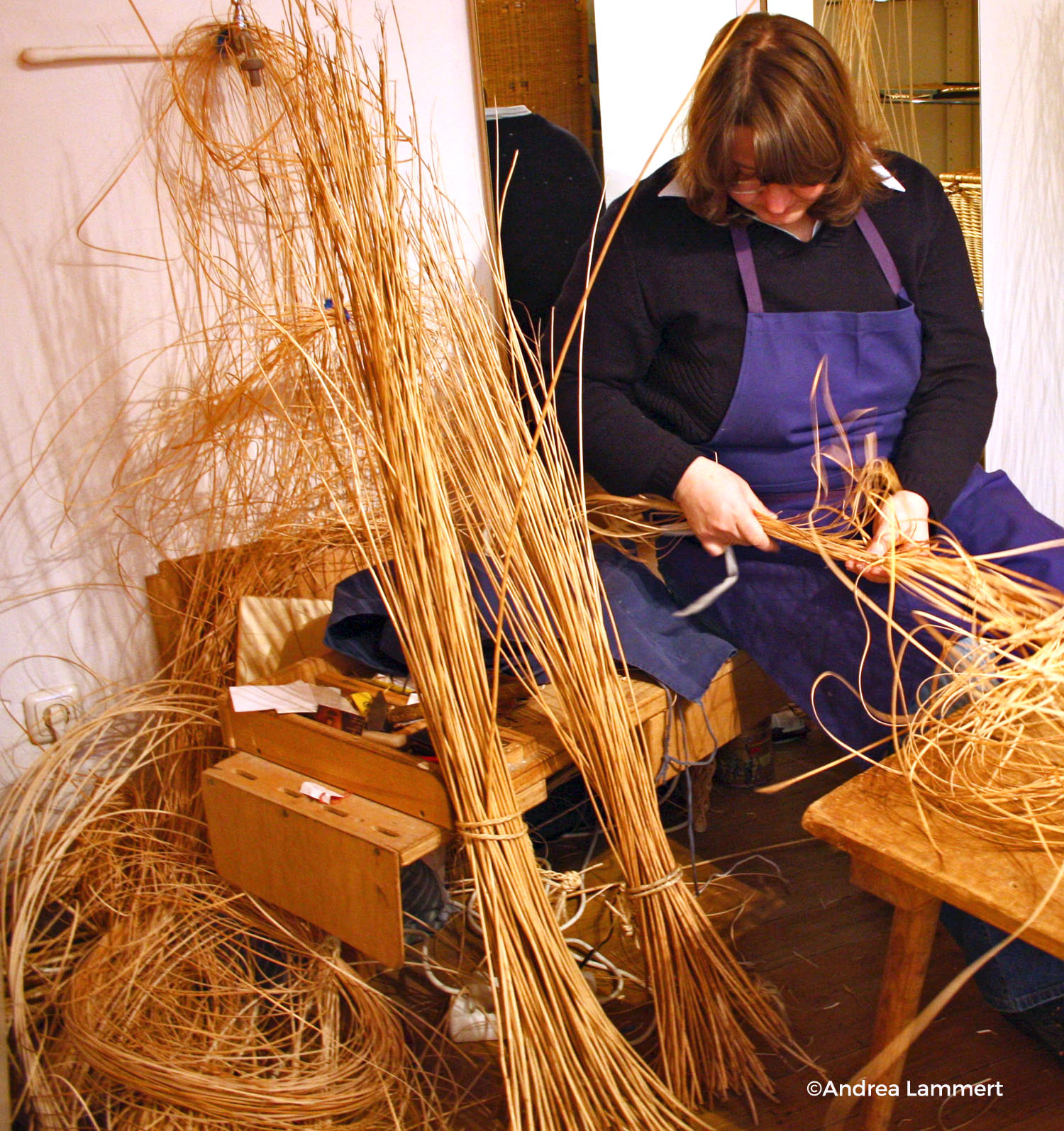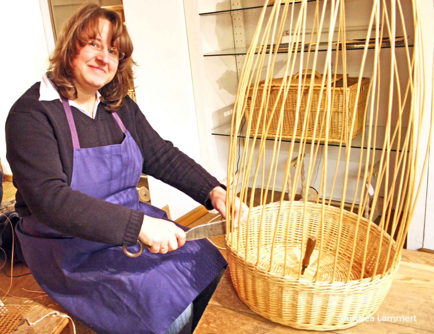 Ursula Butterweck ist spezialisiert auf Möbel: Ihr Lieblingsstück ist gleichzeitig ihr Meisterwerk – eine Récamière. Aber auch Regale aus Flechtwerk, Wickeltische, Sofas und Fußbänke stellt sie her. Sie hat sich die dunkelblaue Schürze der Korbmacher umgebunden und sitzt an ihrem Arbeitsplatz wie Generationen von Korbmachern vor ihr: Breitbeinig auf ihrem Hocker, die schräge Werkbank vor sich. Mit einem Eisen hat sie ihr Geflecht auf der Holzbank befestigt, so dass sie ihr Stück immer drehen kann.