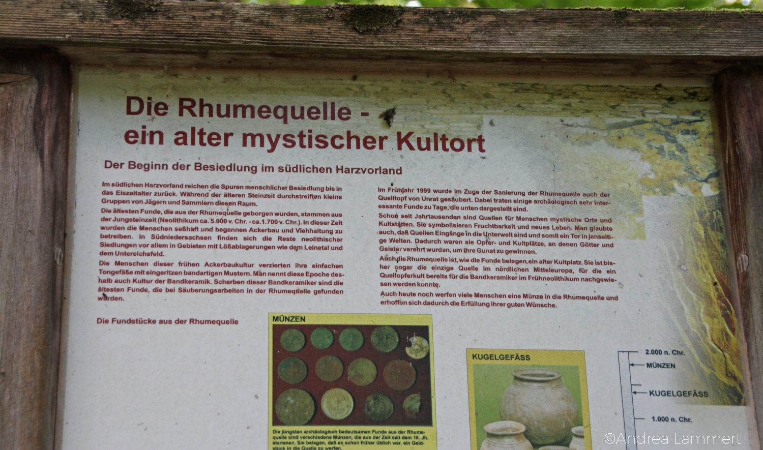 Als im Jahre 1998 eine umfassende Untersuchung des Bodens der Quelle stattfand, fanden Archäologen in den Sedimenten steinzeitliche Klingen sowie eine Fibel aus der Eisenzeit, die wohl als Opfergabe der Quelle dargeboten wurde. Da man keine anderen Besiedelungsspuren hier gefunden hat, gehen Forscher von kultischer Verwendung der gefundenen Gegenstände aus. Damit ist die Rhumequelle möglicherweise die erste Quelle mit nachweislich kultischem Hintergrund in Mitteleuropa. Das jedenfalls beschreiben auch die Hinweisschilder.