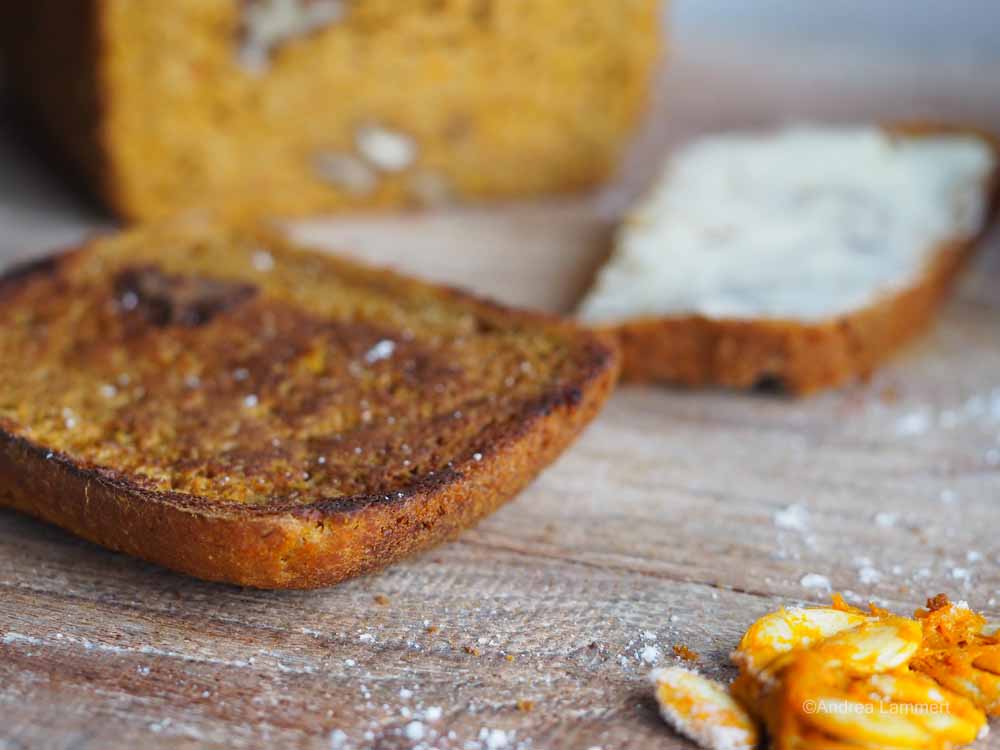 Oktober ist Kürbiszeit. Er kommt jetzt einfach überall hinein. Ob in die Suppe, in den Kuchen, ob mariniert oder gebacken – Kürbis ist irgendwie universell einsetzbar. Ich finde ihn im Brot super, weil er kaum Eigengeschmack hat, aber das Brot schön saftig macht. Vor allem, wenn man wie ich, ständig mit Dinkelmehl backt. Deswegen hab ich mein Toastbrotrezept jetzt mit dem Kürbisbrotrezept gemischt und herauskam das Kürbis-Toastbrot.
