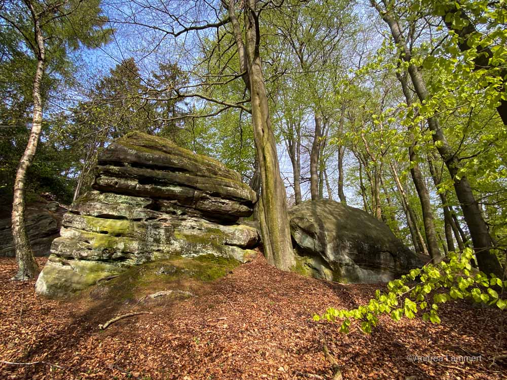 Gut einen Kilometer Wanderung muss man schon auf sich nehmen, um von Altenhagen zu diesem magischen Ort zu gelangen. Hier am Nesselberg beginnt ganz unvermittelt eine andere Welt. Es ist schon auf dem Wanderweg zu spüren, auch der Wald verändert sich. Wer genau schaut, erkennt verwitterte Felsen zwischen den Buchen. Irgendwann taucht dann am Wegesrand ein Schild auf, das die Kukesburg und den Steinbruch erklärt. Genau dort lohnt es sich, links dem schmalen Weg zu folgen und eine andere Welt zu betreten. Alles wird plötzlich lichter und feiner, selbst die Vegetation ist anders. Schon nach einigen Schritten türmen sich plötzlich zwei riesige Felsen auf, die in der Mitte wie ein Tor wirken. Ein beeindruckendes Bild, das eher aus Süddeutschland stammen könnte als aus Niedersachsen.