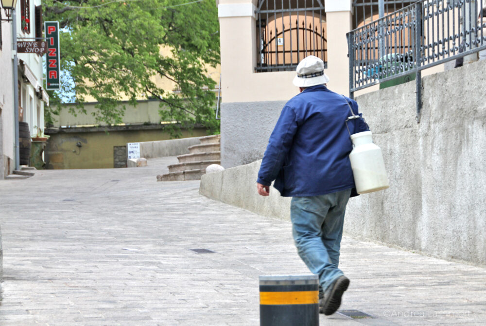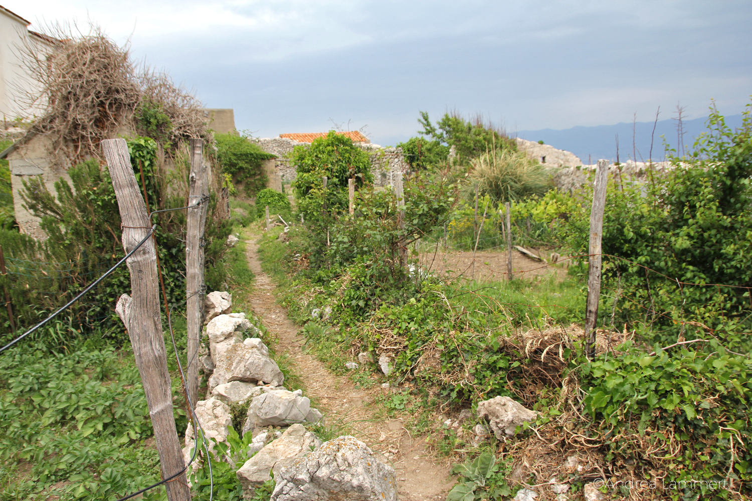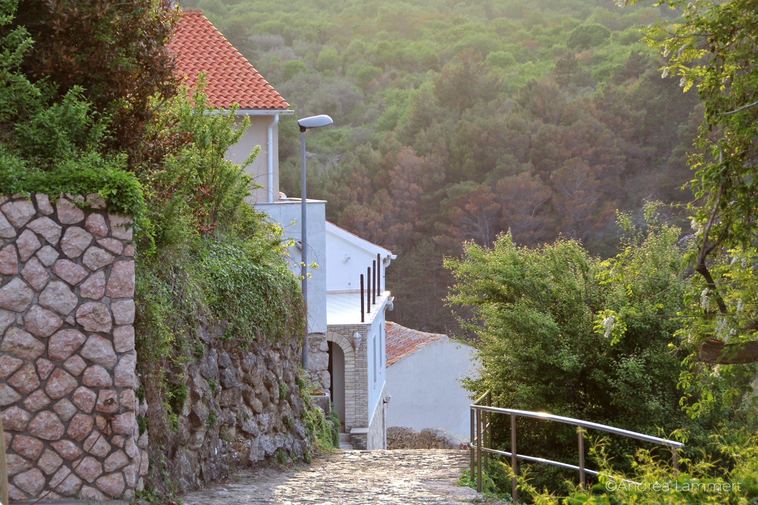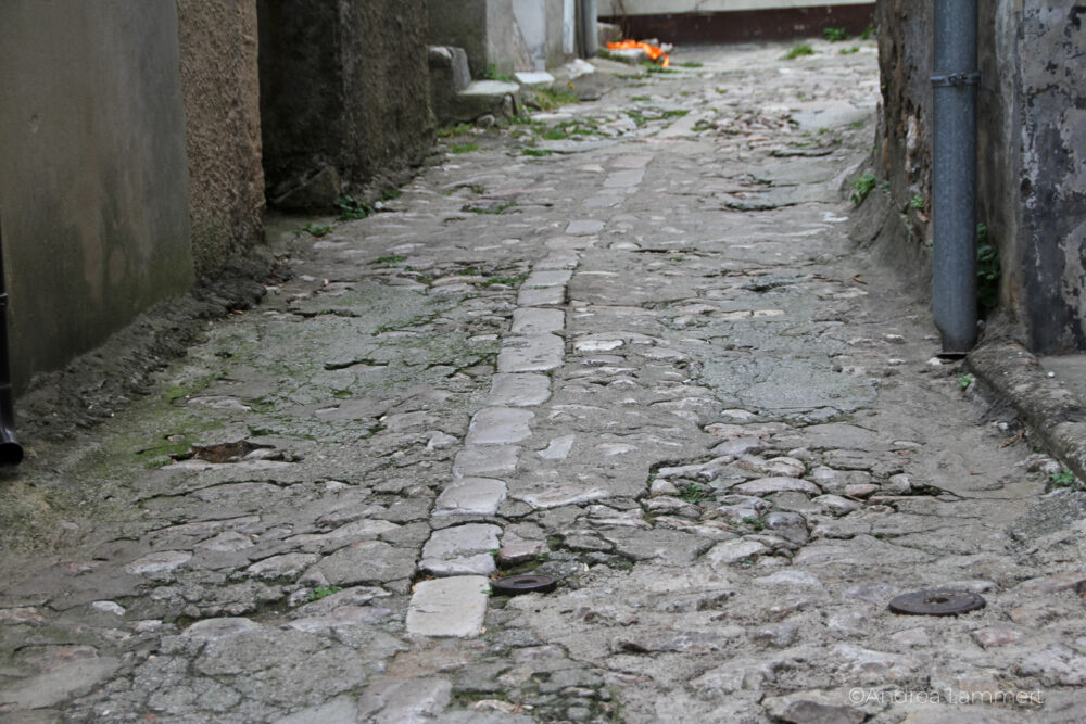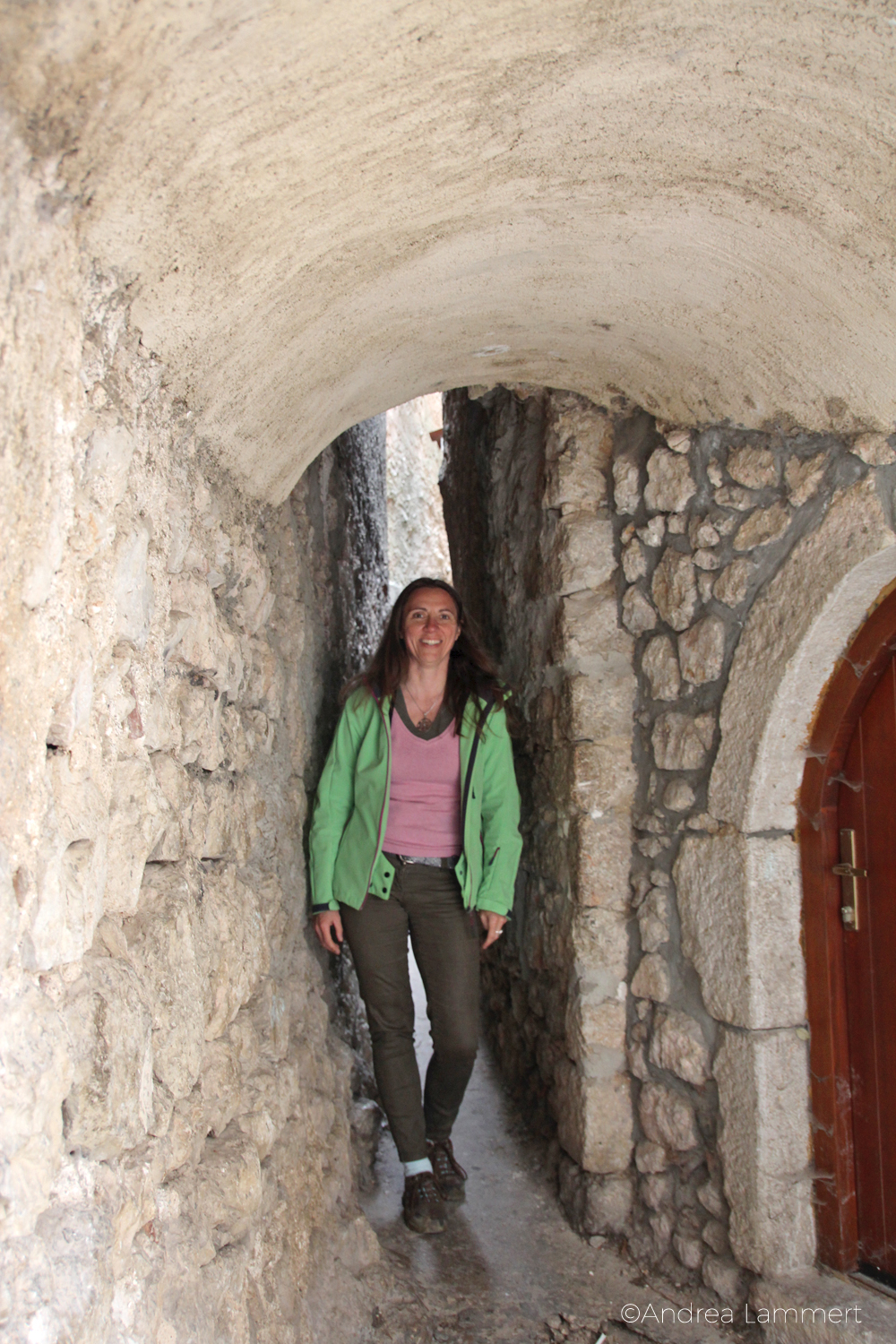 Dinko Diminic ist Winzer und wollte eigentlich nur schauen, ob der noch für das anstehende Wochenende, an dem er Besuch bekommt, Staubwischen muss, als wir ihm auf der Straße begegnen. Schnell bittet er uns in seinen kleinen Weinkeller, putzt zwei Gläser und füllt goldgelben Zlahtina ein. Draußen ist es nieselig und wir sind richtig durchgefroren – hier drinnen riecht es nach Keller und Wein. Dinko Diminic drückt uns die Gläser in die Hand: „Živjeli“ sagt er – prost – und spült seine Portion geübt hinunter. Der Wein trägt die typische Süße der spätreifen Trauben und enthält oft 15 Prozent Alkohol. Er liegt ganz weich auf der Zunge und – das Wichtigste bei diesem Wetter – beginnt im Bauch sofort zu wärmen. Zuviel davon sollte man nicht trinken, denke ich noch so, als ich später wieder an der frischen Luft bin und sich nur wenige Meter vom Keller entfernt vor mir die einst engste Gasse der Welt auftut. Dass es eine Gasse ist, ist gar nicht offensichtlich, es sieht aus wie eine Felsspalte, so unregelmäßig. Ich passe mit den schmalen Schultern gerade so dadurch.