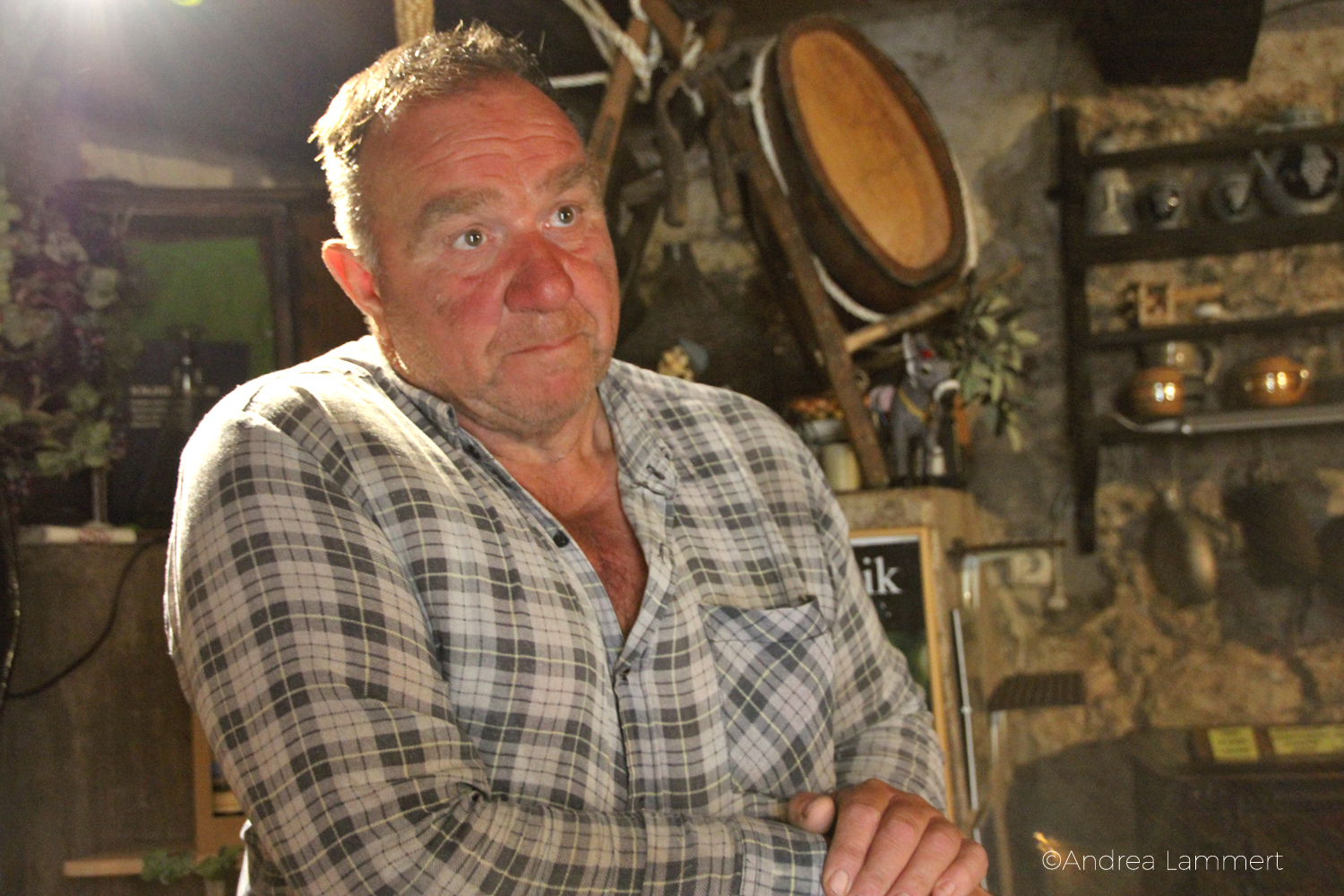 Doch es kann hier auch sehr lebendig werden, das erzählt uns später Zeljko Juranic. Er ist Winzer und produziert 60.000 Flaschen Wein im Jahr. In der Sommersaison ist der Ort ein beliebtes Touristenziel, ganze Busse kommen her und wollen den berühmten Wein der Insel Krk trinken. Wir haben ihn schon gekostet – bevor wir Zeljko Juranic und seine Cafébar Dubravka entdeckt haben, ist uns eine geöffnete Tür in einer kleinen Gasse aufgefallen, aus der Gläsergeklapper kam. Unscheinbar war sie, die Tür, sah eher aus, als führe sie zu einem Privathaus.