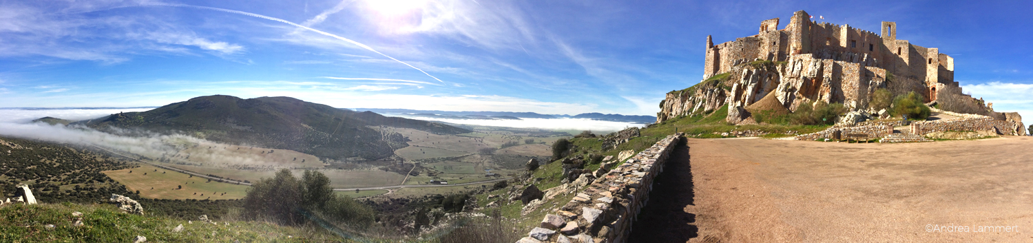 Auch nicht die orangerote Erde, die hier so schöne Kontraste mit dem blauen Himmel lieferte, alles war weiß und grau an diesem Morgen. Ich habe meine Freundin in Spanien besucht und jedes Mal zeigt sie mir eine andere, hübsche Ecke ihrer Heimat. Heute eben in die Klosterburg Calatrava la Nueva aus dem 12. Jahrhundert. „Wenn das Wetter so weitermacht, werden wir die Burg gar nicht sehen“, bedauerte meine Freundin schon, weil die Sichtweite derart gering war. Aber manchmal braucht man eine Portion Glück – und die hatten wir, denn die Wolkendecke riss unmittelbar vor dem Kastell auf und zeigte eindrucksvolle Bilder.