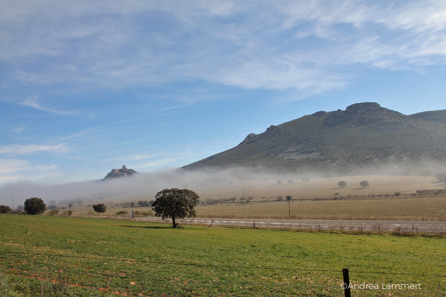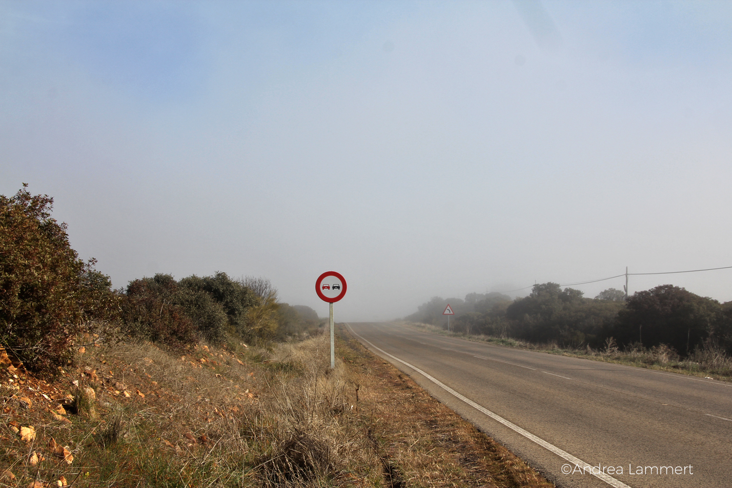Nebel lag wie eine dichte Suppe über der schönen Landschaft in sich Rebstöcke und Olivenbäume hübsch am Straßenrand aufreihen. Aber noch nicht mal die konnte ich sehen, es war wie eine Fahrt durch ein Milchglas, als wir uns auf gen Schloss Calatrava la Nueva machten.