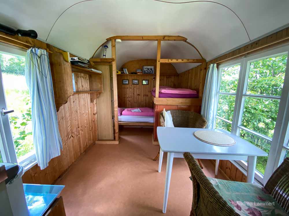 Der grüne Bauwagen im Obstgarten ist nicht alles, davor gibt es eine Feuerstelle und weit hinter dem Bauwagen ein Gehege für Ziegen, die irgendwie auch zur kleinen Farm von Hausmann gehören. Dazu noch Pferde, denn Hausmann ist Reiter. Daher stammt auch die Idee mit dem Bauwagen, der eigentlich nur als Unterkuft für Wanderreiter gedacht war.