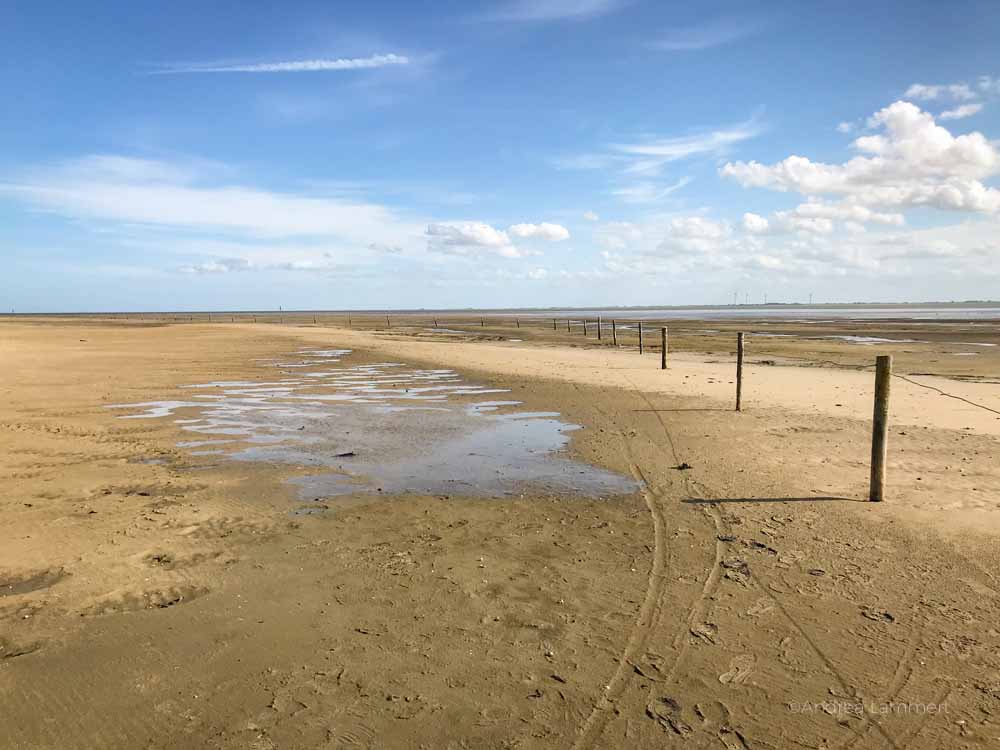 Es gibt einen Weg, der durch die Salzwiesen bis zum Strand führt. Am Ende steht ein Vogelbeobachtungshäuschen, auf dessen Terrasse ich hätte stundenlang sitzen können. Also am besten eine Thermoskanne mit Tee mitnehmen. Zum Flinthörn muss man zu Fuß, es gibt einen Fahrradparkplatz am Einstieg des Wanderweges.