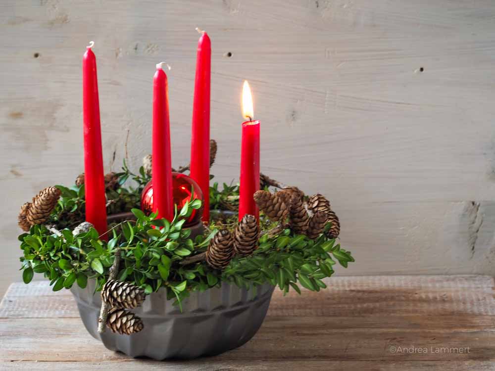 Adventskränze binden, ist aufwändig, sie zu kaufen, kann teuer werden. Und nicht jeder mag sie dann im Haus. Sie nadeln und brauchen ein Tablett oder Teller als Unterlage. Da gibt es andere Alternativen. Etwa den Adventskranz im Guglhupf. Er lässt sich ruckzuck aufstellen, ist im nächsten Jahr wiederverwendbar und produziert so gut wie keinen Müll.