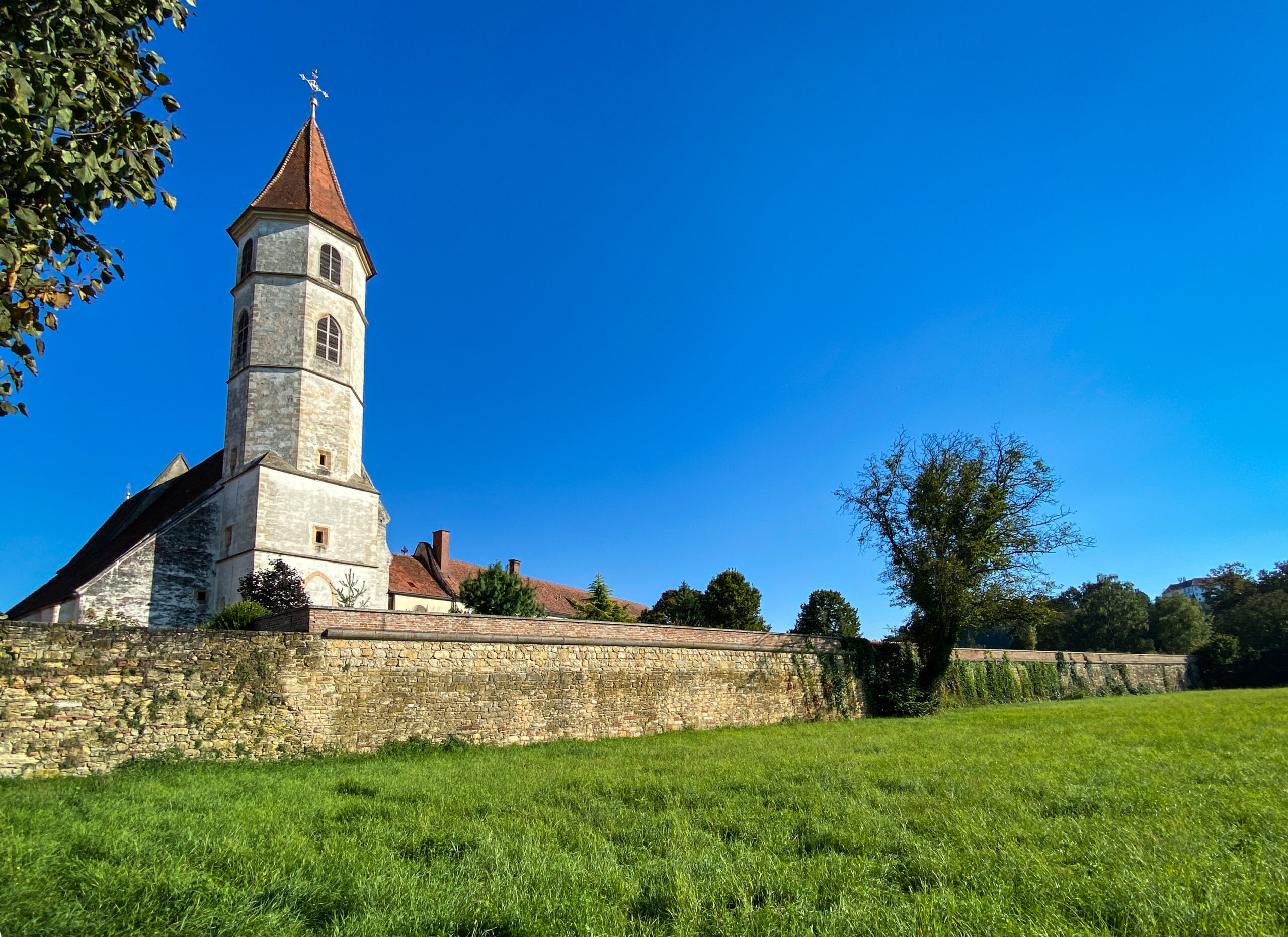 Die Frauenkirche versteckt sich in eine schattigen Innenhof, der sich an den Hauptplatz anschließt. Die Kirche ist nicht nur ein lauschiger Platz in der Stadt, sondern hat auch eine spannende Geschichte, denn ihr heutiger Chor war wohl einst eine Synagoge, die später zur Kapelle umgenutzt wurde. Mitte des 17. Jahrhunderts hat man die Kirche dann neu errichtet um die alte Synagoge herum errichtet. Besonders sehenswert sind nicht nur das Innere mit dem Hochaltar und den Fresken, sondern auch das Äußere. Es lohnt sich, am Turm hinauf zu blicken, an den Ecken sind vier steinerne Schutzheilige zu finden: Florian gegen das Feuer, Urban für das Gedeihen des Weines, Johannes gegen Hagel und Sebastian gegen Seuchen und Pest. Der Platz vor der Kirche bietet sich zum Innehalten und Pause machen an.
