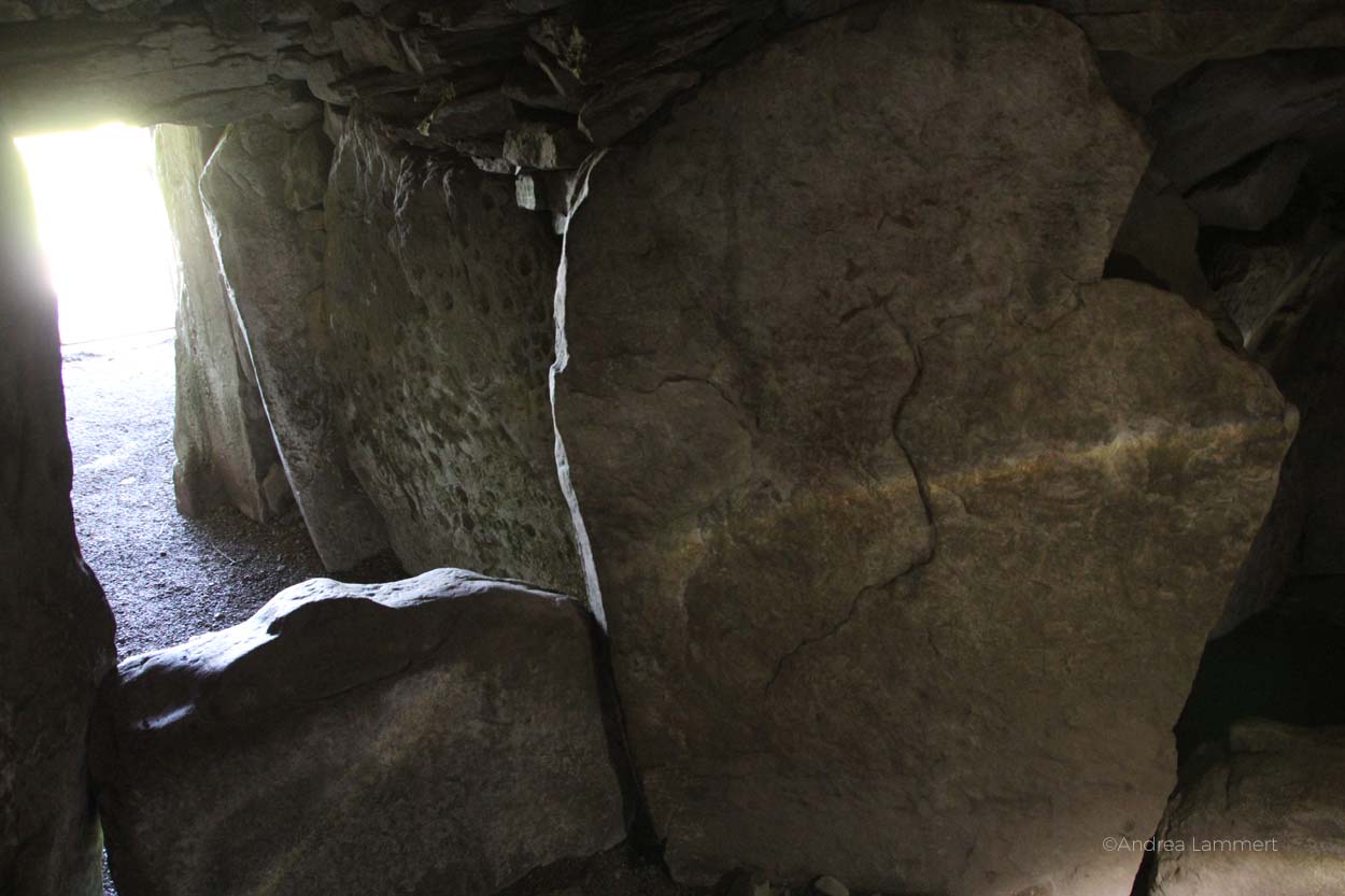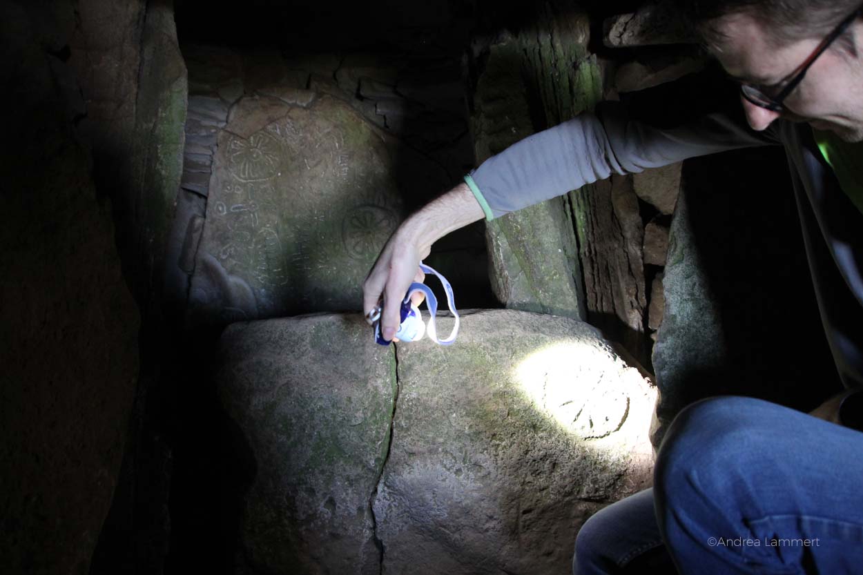 Mit einer Taschenlampe führt der Guide das Spiel der Lichter vor, das zur Tag-und-Nachtgleiche im Fühjahr und Herbst passiert. Am 21. September und 21. März (und nur dann) erreichen die Sonnenstrahlen einen ganz bestimmten Winkel und beleuchten das Innere des Steingrabes. Für einige Momente beleuchten sie den mittleren Stein und seine Verzierungen.