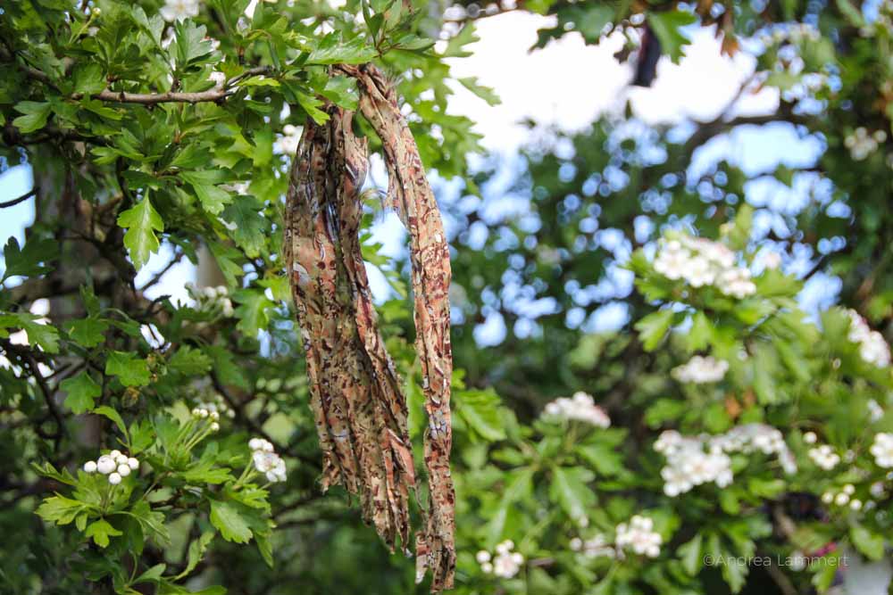Ein schmaler Weg führt bergauf, eingerahmt von einer Hecke. Es ist wie der Eintritt in eine andere Welt. Der Weg ist eingerahmt von einer Hecke. In die Äste sind bunte Bänder gewebt und flattern wie kleine Fahnen im Wind. Ein irischer Brauch, um eine kleine Opfergabe an einem Kraftort zu lassen, ähnlich wie das Anzünden einer Kerze.