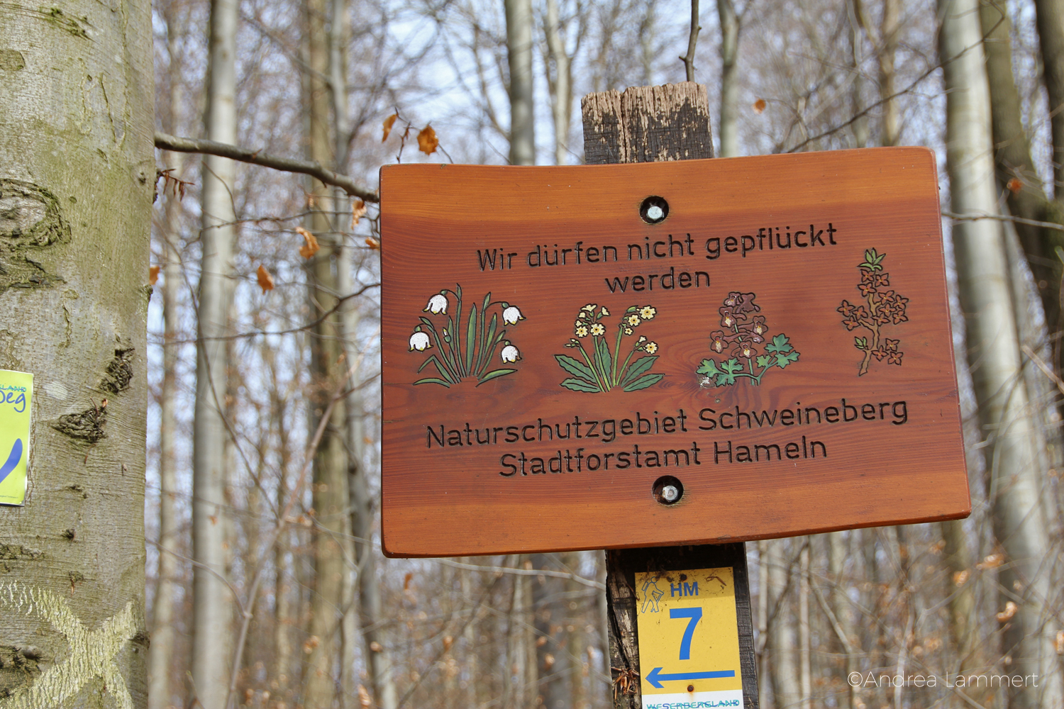 Dann hoffen wir, dass Schnee und Eis schnell schmelzen, damit rechtzeitig zur Blütezeit, alle Märzenbecher in Hameln es noch schaffen, sich durch die Schicht schützender Buchenbätter zu stechen und den braunen Waldboden weiß färben. Übrigens sagt man, dass die Blumen früher von den Marktfrauen nach Hannover gebracht und dort verkauft wurden. Gut, dass sich dennoch so viele Knotenblumen hier am Schweineberg gehalten haben. Ein schöner Ausflugstip im Frühjahr. Der Rundweg zu den Märzenbechern am Schweineberg in Hameln führt etwa 5,6 Kilometer um den 280 Meter hohen „Berg“. Man kann aber auch Abkürzungen nehmen, dann ist die Gehzeit vom Parkplatz bis zu den Blütenlichtungen rund eine halbe Stunde lang. Und das Forsthaus Heisenküche hat für jede Tageszeit die passende Stärkung bereit. Und ist sehr gemütlich von innen, die Küche ist gehoben und sehr schmackhaft.