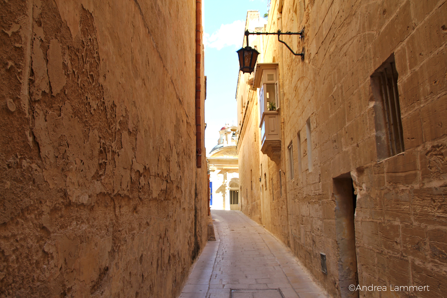 Weiter geht es nach einem Essen der leckeren Blätterteigtaschen, gefüllt mit Kichererbsenpüree und Käse, in die benachbarte Zwillingsstadt Mdina, ein eindrucksvolles Zeugnis maurischer Baukunst. Der Taxifahrer hatte mir gesagt, dass ich morgens um 8 hingehen sollte, da sei die Stadt am schönsten, und am besten die Kirche besuchen sollte. Das war bei dem Programm nicht möglich, aber dennoch hat mich die Altstadt beeindruckt mit ihren goldgelben Sandsteinwänden, die aussehen, als gehörten sie zu einer Burg oder einer Festung und den hübschen Stadthäusern zwischendrin.
