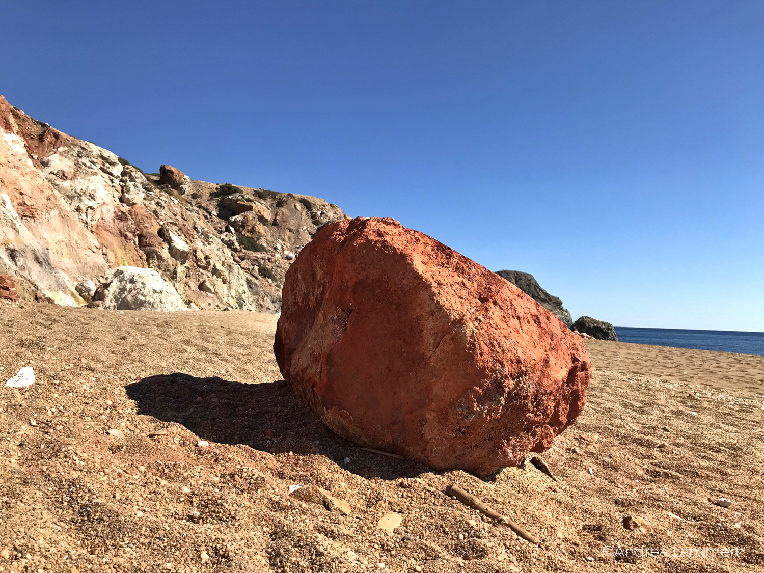 Eine heiße Quelle an einem Strand? Nichts wie hin da! Dass es dort allerdings dann nach verfaulten Eiern riechen würde, daran hatte ich nicht gedacht. Aber nur am Anfang des Strandes, auf der Höhe der heißen Quellen eben, denn mit den Fumarolen tritt auch Schwefel aus dem Wasser, das eben diesen Geruch erzeugt. Und ein eisenhaltiger Stoff muss es auch sein, denn das Meer ist an einer Stelle in Milos ganz rot. Auf jeden Fall gibt es hier beim Schnorcheln auch eine ganz andere Fischwelt als an den anderen Stränden. Zudem ist Paliochori einer der beliebtesten Strände der Insel mit Restaurants, Jet-Ski-Verleih und Kanutouren. Liegen zum Mieten gibt es auch und der Strand lässt sich gut mit dem Bus erreichen. Fazit: Die teilweise roten Felsen sind ein Erlebnis, ebenso wie die Schwefelquellen, die auch an nicht so warmen Tagen für angenehme Wassertemperaturen sorgen. Der Strand an sich ist etwas kieselig und er beginnt flach, fällt aber schnell richtig tief ab.