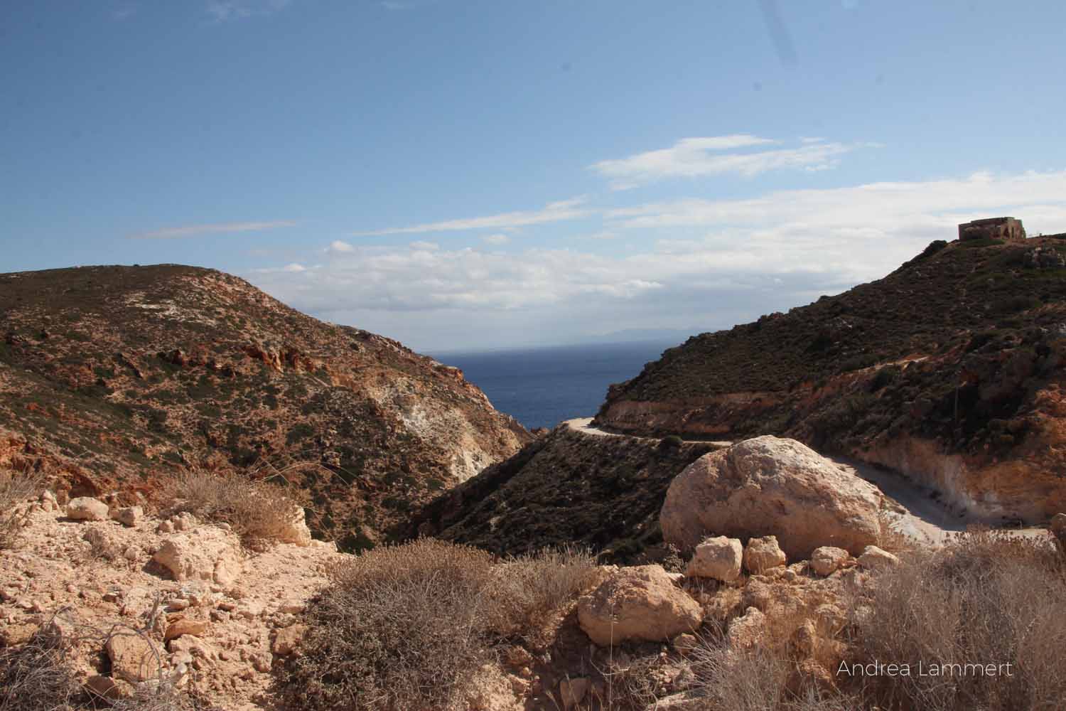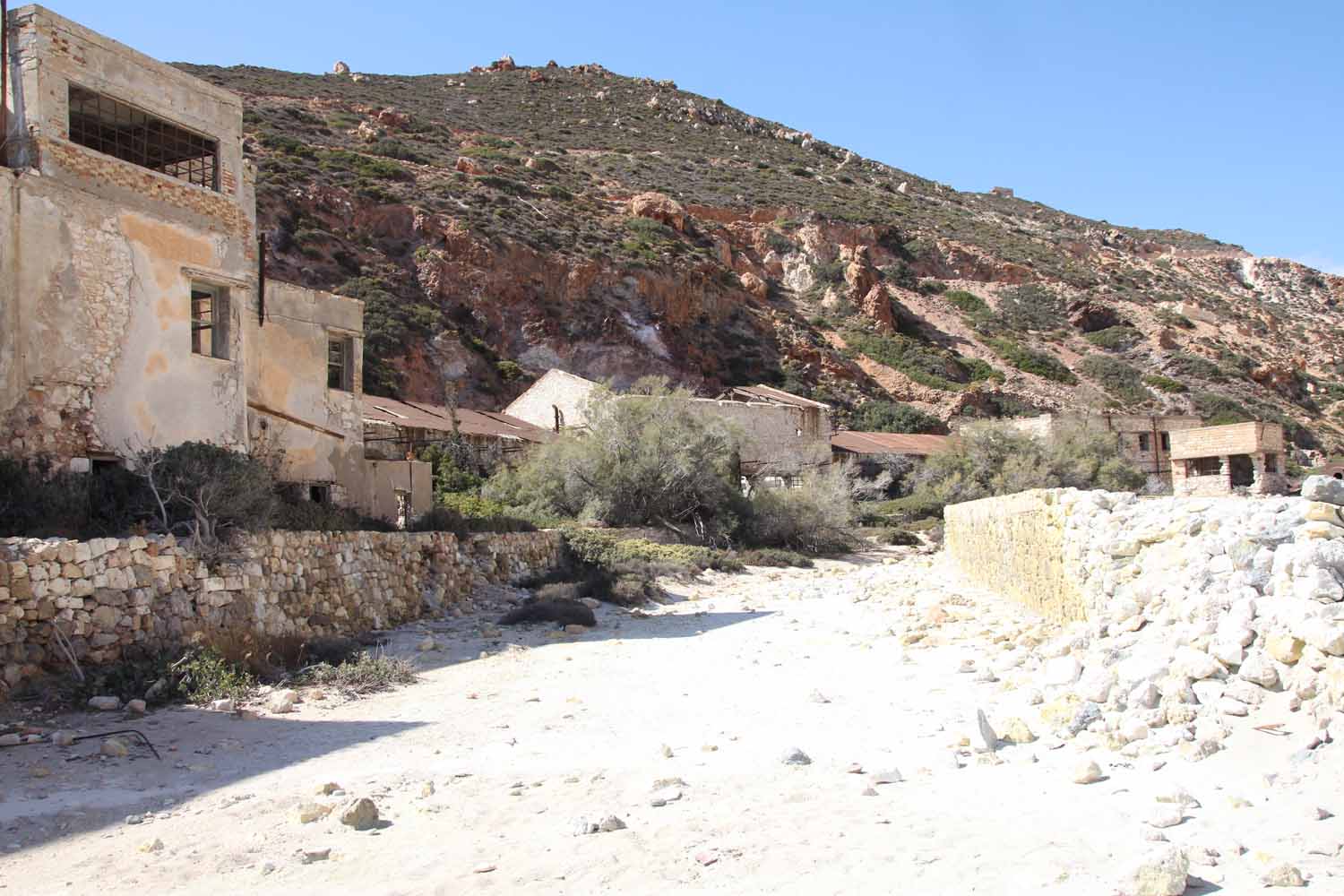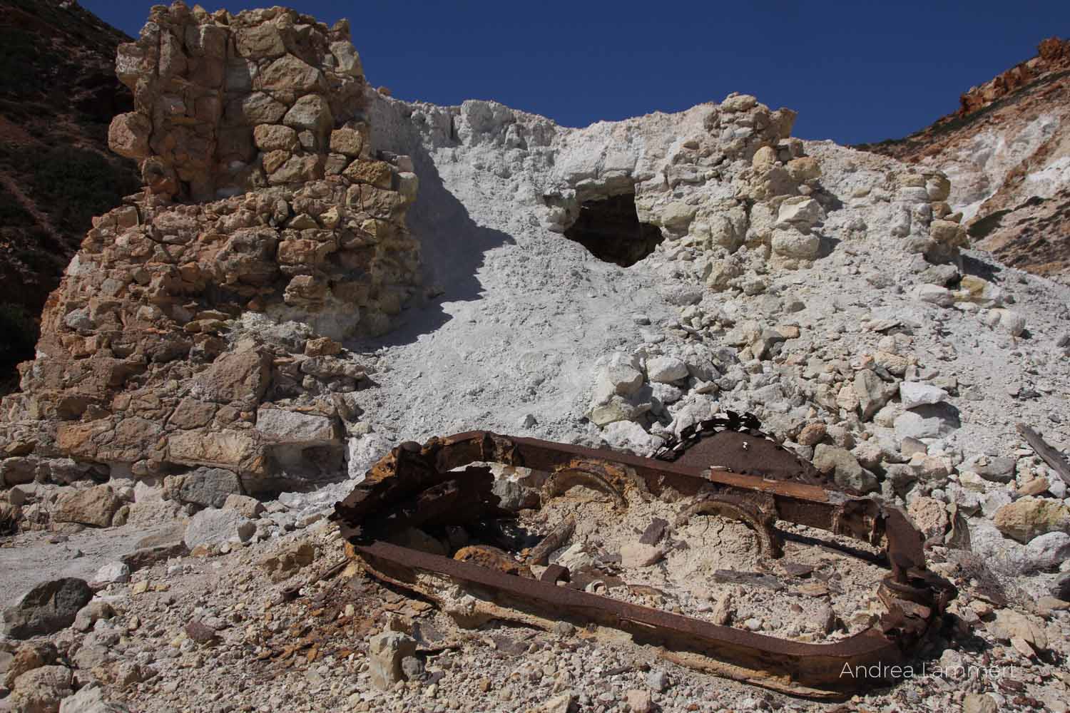 Waren es in der Altsteinzeit noch Obsidiane, die die Menschen für Waffen und Werkzeuge brauchten, weil sie so schön scharfkantig waren, später Mühlsteine, die möglicherweise für den Inselnamen sorgten und in neuerer Zeit Kaolin und Schwefel, sind es heute Betonit und Perlit, die aber nicht mehr unterirdisch, sondern im Tagebau gewonnen werden. Vor allem bei Pollonia aber auch auf der Strecke zu den stillgelegten Schwefelminen in Paliorema sieht man immer wieder am Wegesrand die großen Löcher. Sie gleichen riesigen Amphitheatern, von mächtigen Baggern in die Erde gebuddelt, um an die Rohstoffe zu kommen. Was man heute mit Technik, großen Motoren und viel Maschinenkraft birgt, haben sich die Menschen auf Milos einst hart erarbeitet.