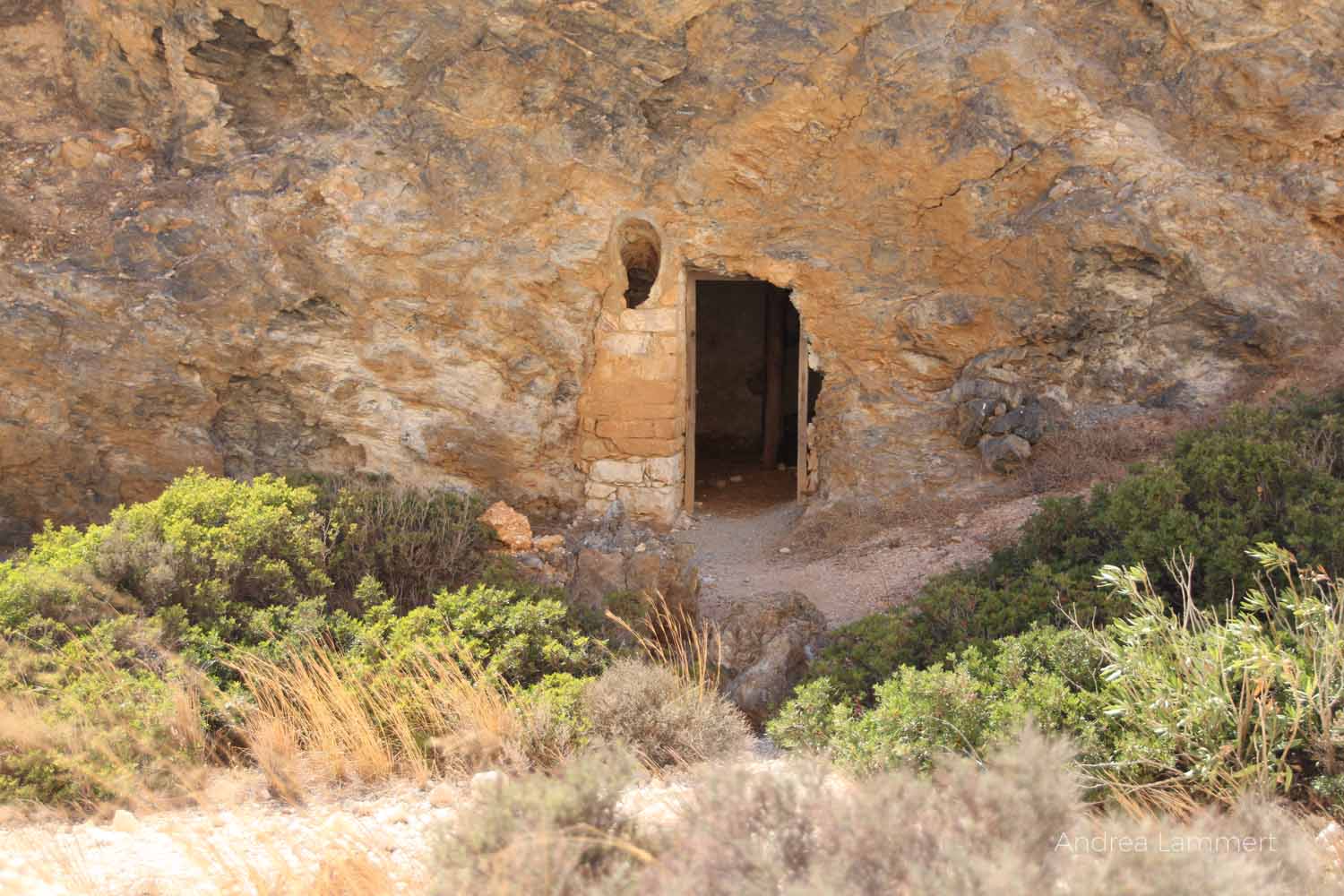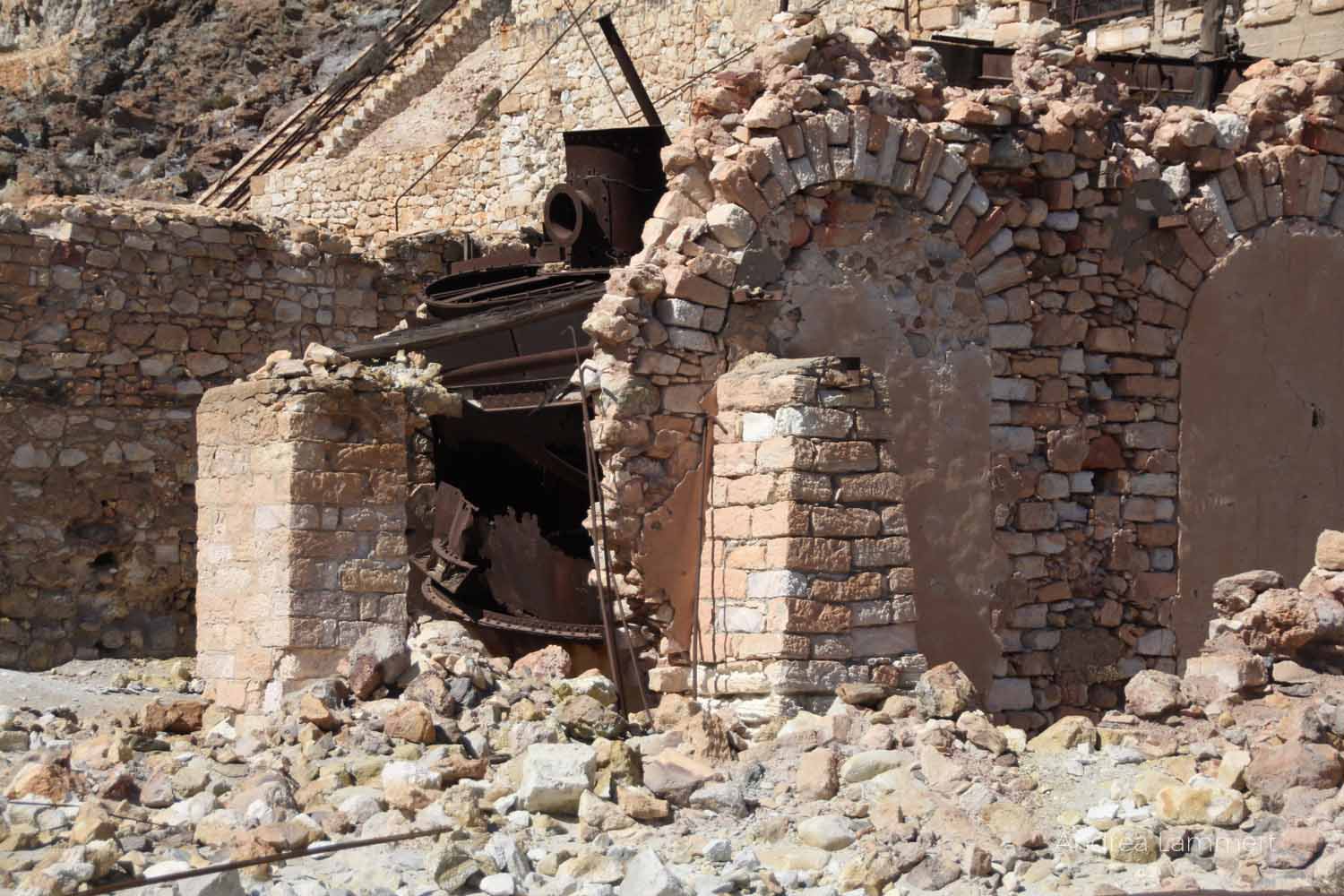 Viele Höhlen und Gänge befinden sich unter den Straßen und Wegen der Insel, doch das wohl schönste Bergwerk sind die verlassenen Schwefelminen von Paliorema an der Ostküste der Insel. Die Frau vom Mietwagenverleih hatte uns schon gewarnt und mir dabei scharf in die Augen gesehen: „Fahrt nicht auf diesen Straßen. Dafür sind unsere Autos nicht gemacht.“ Wir taten es natürlich doch, denn der Weg zu den Schwefelminen ist mit Kindern in der Hitze viel zu lang zum Wandern. Und wir kamen auch ein ganzes Stückchen weit, schließlich aber mussten wir unseren süßen Fiat Panda doch stehen lassen und den Rest der Strecke laufen. Und das war gut so, vielleicht hätten wir sonst nie die schwefelgelben Steine auf dem Weg entdeckt.