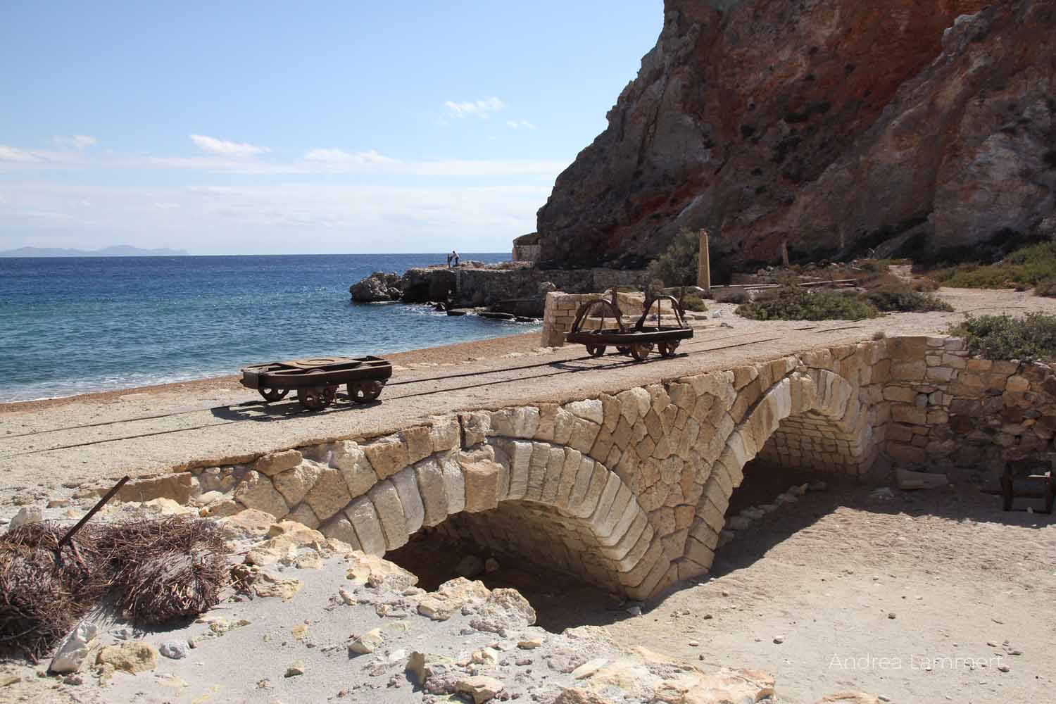 Dass die Minen 1958 stillgelegt wurden, muss irgendwie plötzlich gekommen sein. So wirkt es bei einem Besuch dieses verlassenen Ortes auf Milos. Als ob die Menschen einfach am nächsten Tag nicht mehr zur Arbeit gekommen sind, ihr Bett, ihre Teller oder ihre Werkzeuge haben liegen lassen und die Schwefelminen sich selbst überlassen haben. Ein typischer Lost Place, der nicht nur bei den Kindern Entdeckergeist weckt. Sie schieben die alten Waggons ein Stückchen über die rostigen Gleise und sind schneller als wie gucken können in den Fabrikgebäuden verschwunden. Drinnen ist es schaurig-spannend: Matratzen rotten vor sich hin, in manchen Räumen findet sich sogar noch Geschirr.