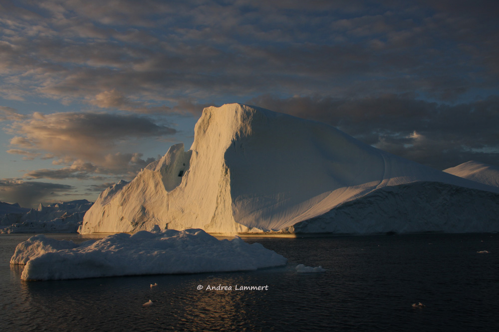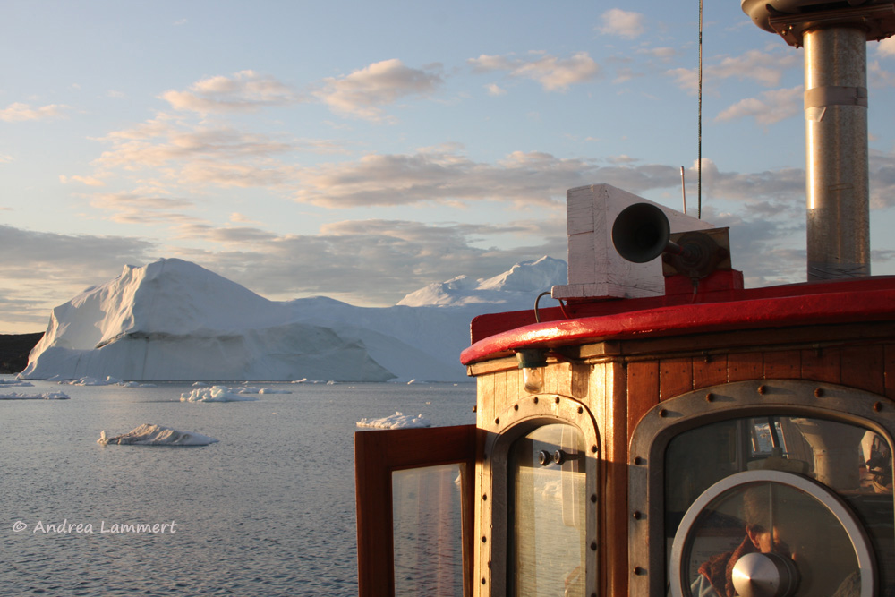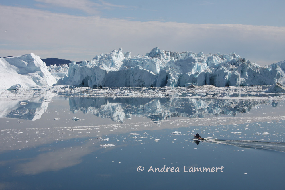 Fischkutter bahnen sich mühsam ihren Weg hindurch und sehen dabei gegen die Eisriesen klein wie Kaulquappen aus. Der Fjord verengt sich zum Meer hin und wird flacher. Da aber der größte Teil des Eisbergs unter Wasser liegt und an der Mündung auf Grund läuft, müssen die Giganten zunächst abnehmen, um weiter zu kommen. Also liegt in der Bucht sozusagen ein Stau der Eisberge, die darauf warten, zu schmelzen, um weiter treiben zu können.