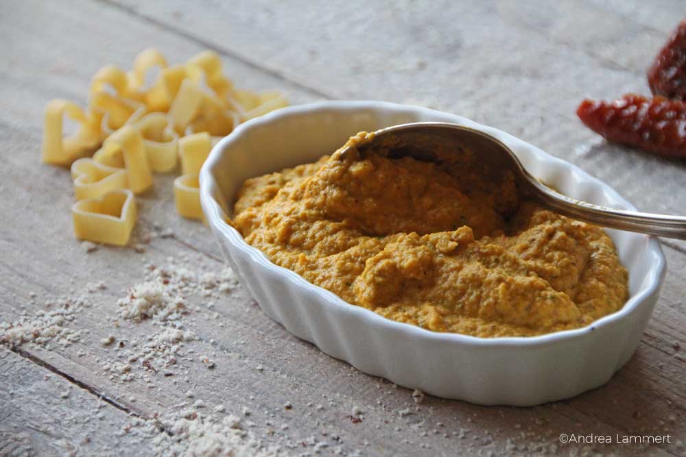 - Möhren, getrocknete Tomaten, Öl, Olivenöl, Mandeln, Hefeflocken, Bärlauchblätter in den Mixer geben und pürieren. Am besten gleich servieren. Es schmeckt nicht nur zu Nudeln, sondern auch kalt als Brotaufstrich.