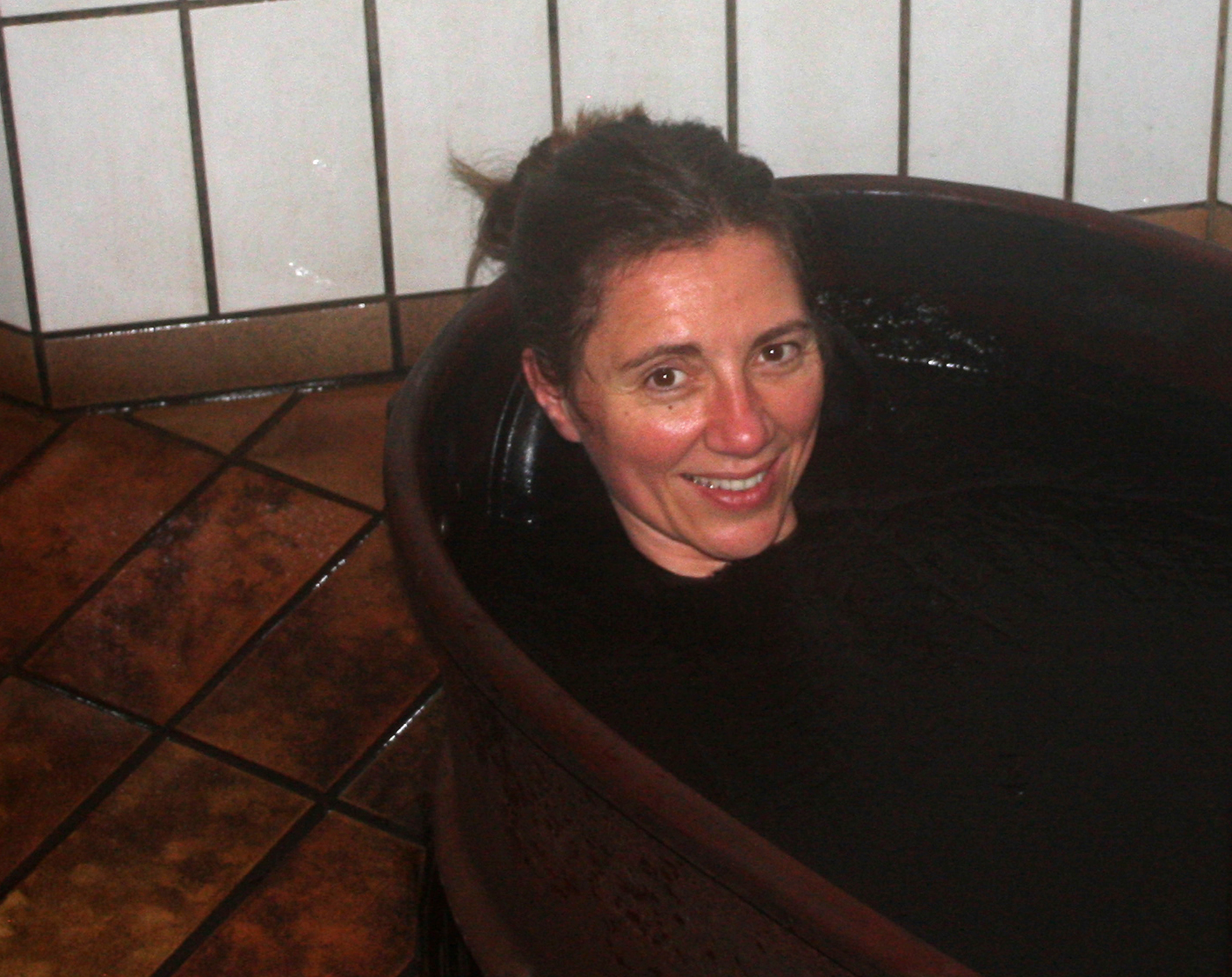 Regelmäßig geht sie in die Badewannen voller dickem, schwarzem Matsch.Es kostet Überwindung, sich in diese Pampe zu begeben und vom Schlamm umspülen zu lassen. „ „Das wird schon“, ermuntert Badefrau Brigitte. Also nichts wie rein da. Es scheint fast so, als sauge der schwarze Brei seinen Badegast auf. Sofort schmaddert das 42 Grad warme Schwarz überall um den Körper herum. Hinlegen geht nur ganz im Schneckentempo. Lohnt sich aber, denn der Körper bleibt irgendwann einfach schweben. Ganz schwerelos in schwarzer Pampe – ein faszinierendes Phänomen.