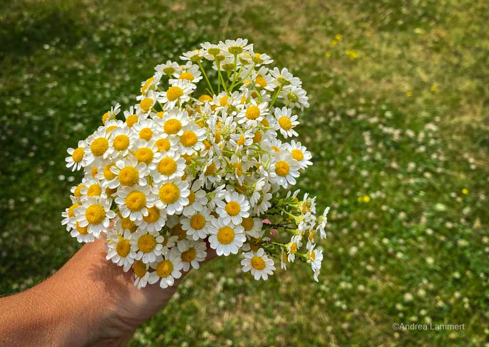 Die Mutterkrautblüten und -blätter pflücken und zunächst etwas im Schatten stehen lassen, damit Krabbeltiere entfleuchen können.
