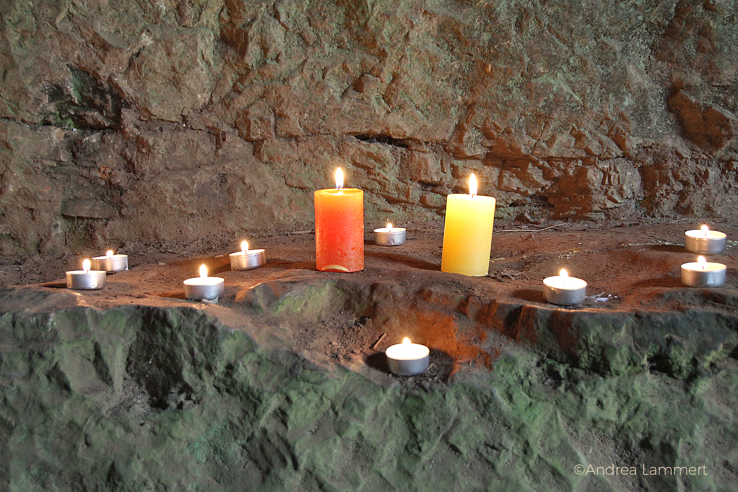 Kleine Felsüberstände wurden als Ältäre genutzt, wie Reste von Kerzenwachs und Co zeigen.Ich finde es einen schönen Brauch, Opfergaben zu bringen und habe immer etwas Reis oder Ähnliches dabei, eine Kerzer hier aber auch, die ich entzünde. Wunderbar sieht die Höhle jetzt aus, ich schaue nach draußen auf die kleine Anhöhe vor der Kirche, die schönen Bäume und den ruhigen Platz. und überlege mir, welche Sagen sich wohl um diese Höhle ranken.
