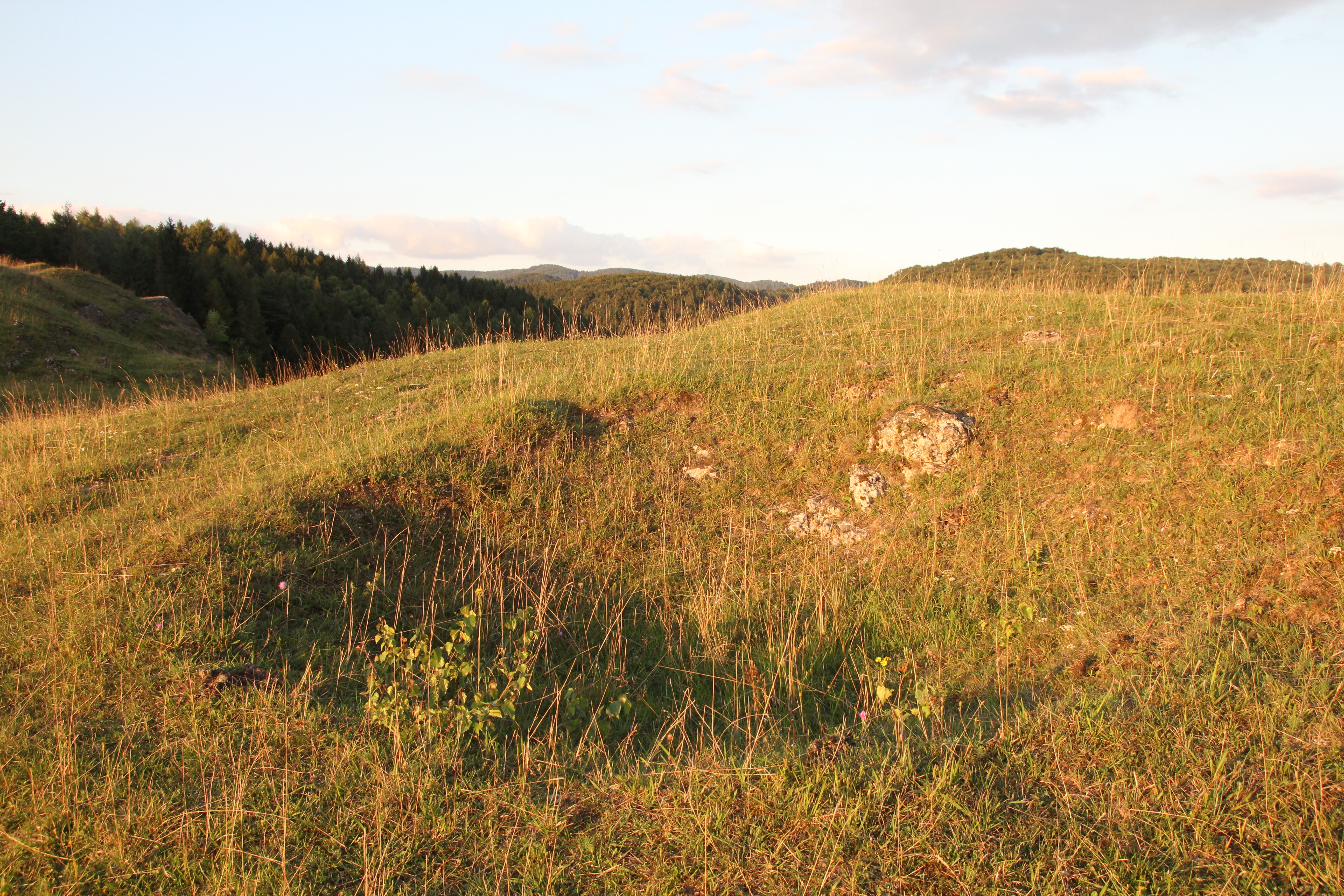 Die wiesenbewachsenen Hügel wellen sich sanft, der Blick reicht weit in die Ferne – und die Bank unter den Eichen ist ein idealer Platz, um den Sonnenuntergang zu betrachten. Und nicht nur das – ich finde, es ist ein wunderbarer Ort zum Auftanken und Kraft sammeln. Ja, fast direkt unter mir führt zwar eine Schnellstraße entlang, aber irgendwie stört mich das hier oben kaum.