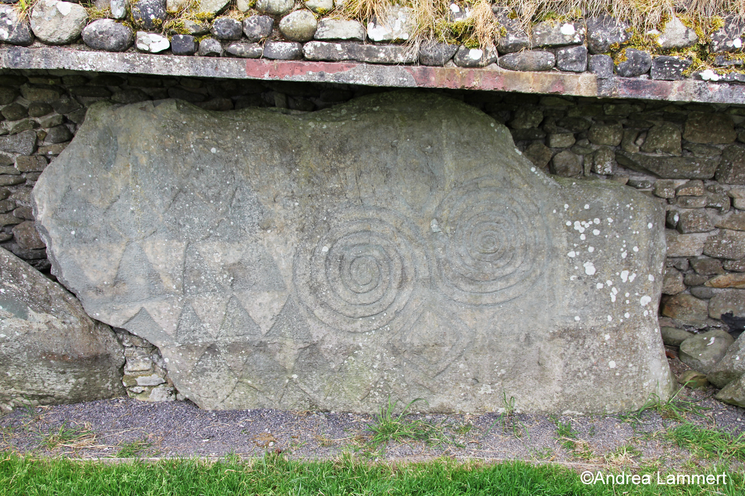 Dann schaltet der Guide das Licht aus, holt seine Taschenlampe hervor und erzählt uns im Stockdunklen das Wunder. „Es ist so gebaut, dass während der drei dunklen Tage im Jahr rund zu Solstice (Sonnenwende) ein kleiner Lichtstrahl seinen Weg durch den langen, dunklen Gang findet und genau auf die Steine fällt, die die Mitte der Inneren Grabkammer markieren wie ein Altar. Die Steine sind flach wie Tafeln (Fotografieren war dort nicht erlaubt), auf denen keltische Muster eingeritzt sind – und zwar unter anderem wieder die Triskele. Zur Wintersonnenwende erreicht die Sonne in Newgrange nun mit einem Strahl nun genau diese Steinplatten, beleuchtet sie kurz und verschwindet wieder aus der Kammer.Nur während weniger Tage ist dieses Ereignis hier zu beobachten, eben zur Wintersonnenwende in Newgrange.