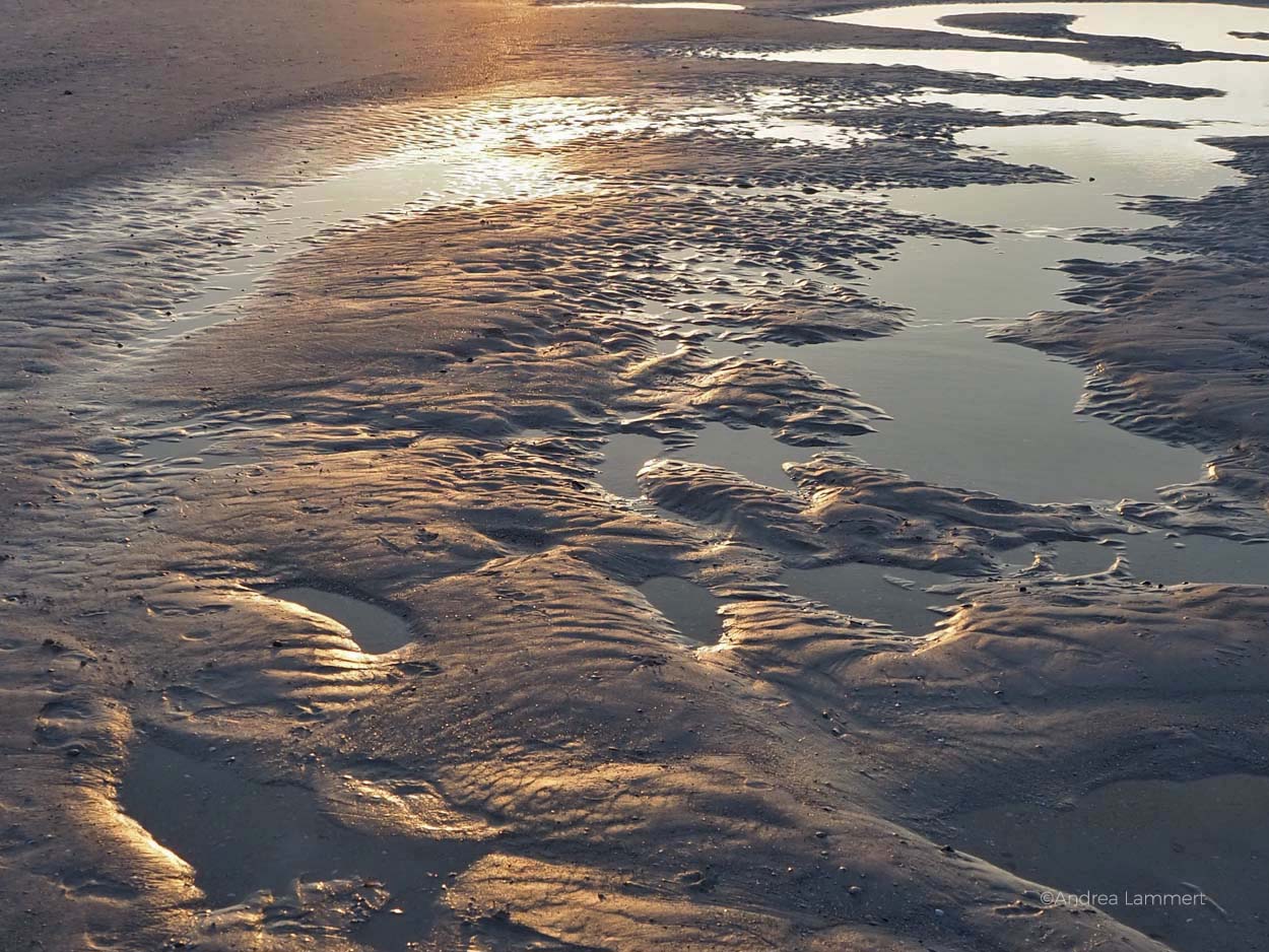 Wir schnappen uns unser schmales Gepäck und spazieren zum Badehaus, unserer Unterkunft für die nächsten Tage. Zentraler kann man kaum wohnen auf Norderney, denn wir nächtigen direkt am Kurpark. Und, das ist meiner Freundin sehr wichtig: Wir haben eine große Saunalandschaft im Haus, die sie gar niczt abwarten kann zu testen. Doch das geht auch im Dunkeln, erstmal müssen wir schauen, wo wir überhaupt gelandet sind. Also ab an den Strand. Ist Ebbe? Flut? Das Meer hat sich zurückgezogen und das Watt glitzert in vielen Tönen, herrlich, diese Nordseelandschaft bei Ebbe und Sonne.