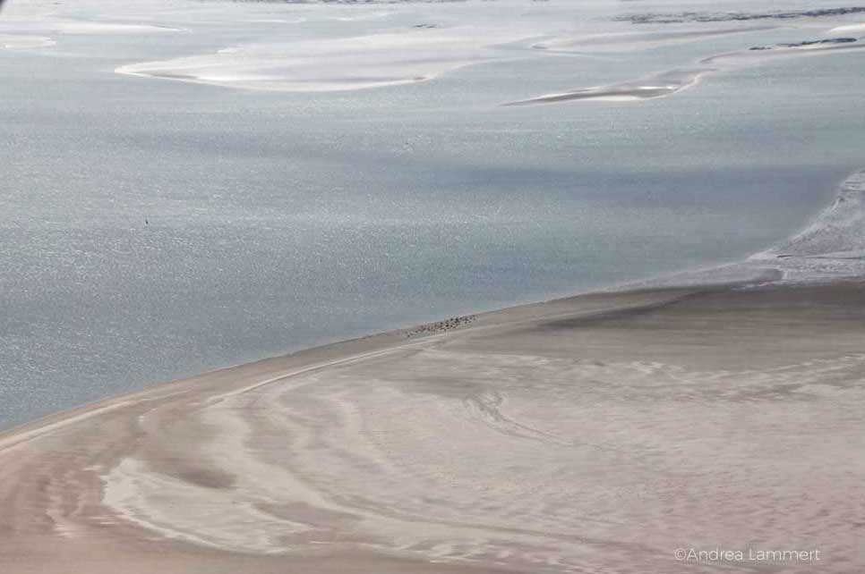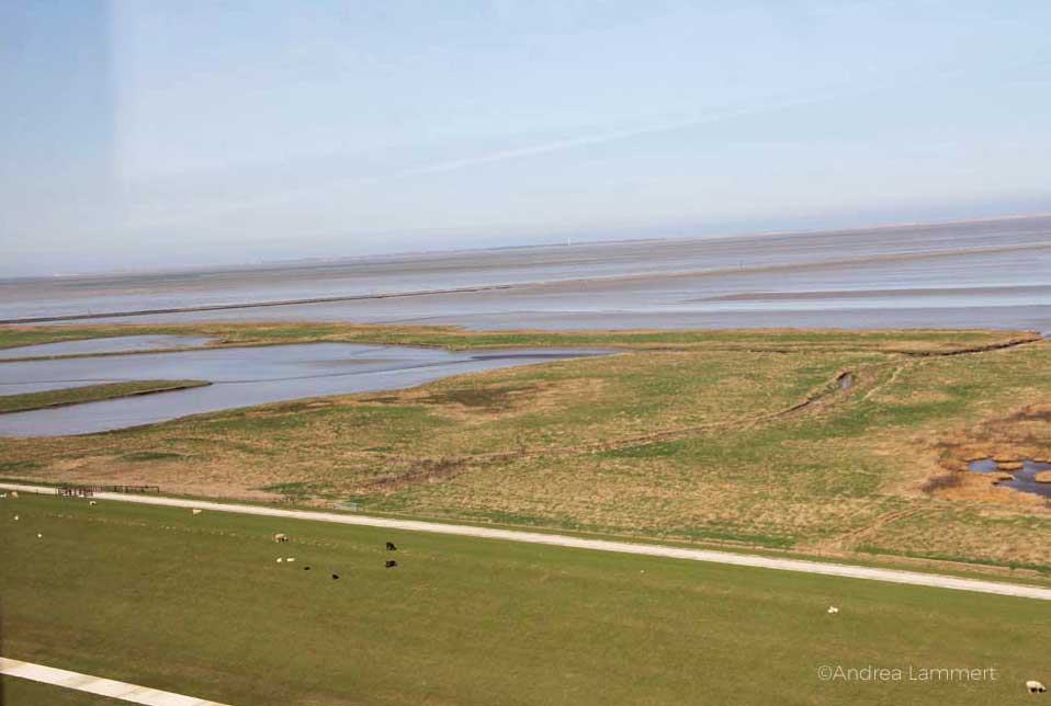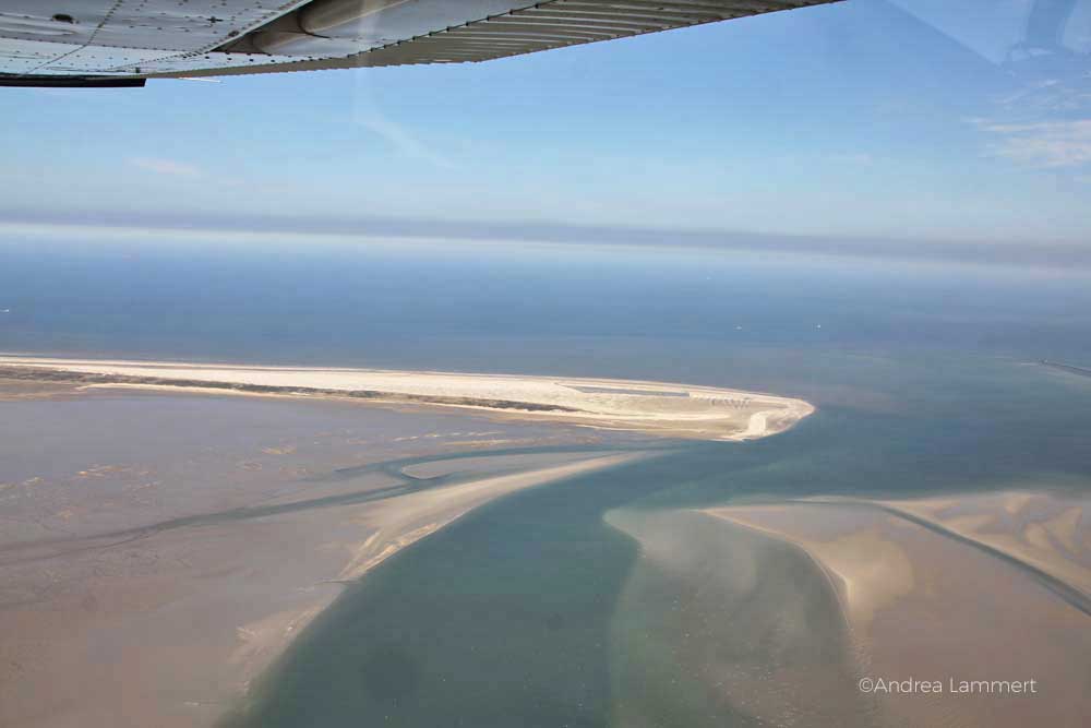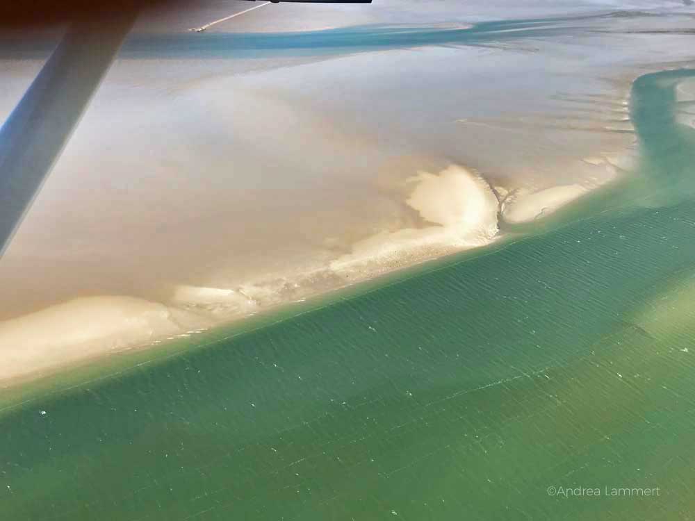 In der kleinen Cessna starten wir vom Flugfplatz Harle aus, sie wackelt und ruckelt, als es in die Luft geht und ich genieße dieses Kribbeln im Bauch. Schon bald aber verschlägt es mir die Sprache, denn was ich erblicke, sieht nun wirklich nicht aus wie die Nordsee, die ich kenne. Sie hat viele Farben, ja. Als erstes aber fällt mir immer Grau ein, grau wie der Himmel, das Wetter und der Schlickboden, der voller Leben steckt. Und natürlich kenne ich die Nordsee auch in Blau, wenn das Wasser wieder da ist und man schwimmen kann. Oder in dunklem Grün, wenn das Wetter strahlend ist. Aber helles türkisgrün? So richtige Südseefarben? Das hätte ich hier nie erwartet. Vielleicht noch in der Ostsee, aber nicht in Ostfriesland.
