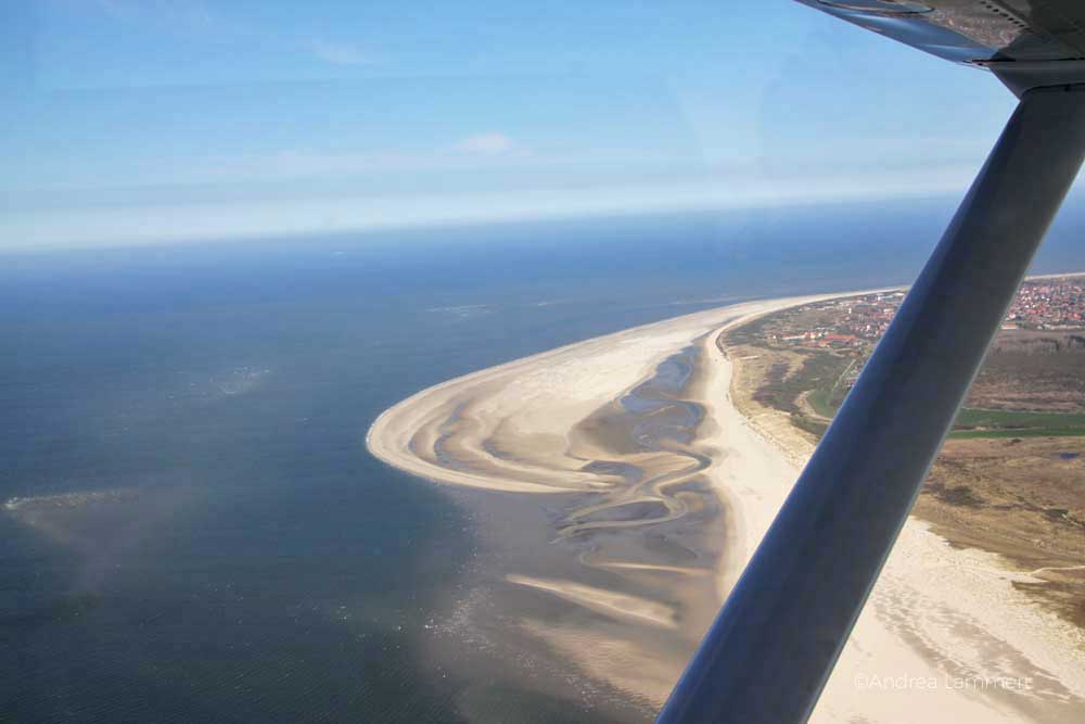 „Wann ist denn die schönste Zeit, um über die Inseln zu fliegen“, hatte ich den Mann am Flughafen vorher gefragt, um meine Reportage über die Nordsee von oben abzuklären. „Hoch- oder Niedrigwasser?“ „Na, Niedrigwasser, wenn man die Priele sieht, das ist einmalig“, hatte er geantwortet und wir haben einen Flug für die Mittagszeit vereinbart. Er sollte Recht behalten. Doch das zeige ich Euch jetzt lieber mal in Bildern. Vorher aber noch eines: Flüge sind für mich immer so eine Sache, ich wäge genau ab, wann es denn in die Luft geht und ob es wirklich sein muss. Das ist als Reisejournalistin nicht immer so einfach. Für diesen Flug haben wir insgesamt 25 Liter verbraucht, denn so eine Cessna schluckt etwa 50 Liter pro Stunde, das entspricht etwa einer Strecke von 500 Kilometern mit meinem Auto. Ich weiß also, was ich demnächst zu tun habe – das Fahrrad ruft schon.