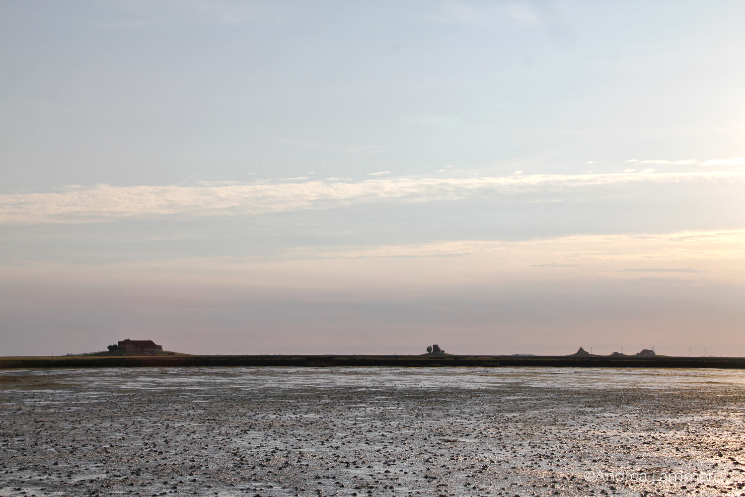 Die Wattwanderung nach Nordstrandischmoor gehört zu den anspruchsvollsten in der Nordsee, weil der Boden unter den Füßen nicht fest ist wie sonst im Wattenmeer, sondern weich wie Butter. Wieso wollte ich nur unbedingt nach Nordstrandischmoor wandern? Eine Hallig kann ja so anders auch nicht sein, als eine ganz normale Insel, oder? Soll ich nicht lieber umkehren? Und wie immer ist es meine Neugier, die mich vorantreibt, die mich weitergehen lässt, anstatt umzudrehen. Ich bin völlig müde, total hungrig, doch jetzt aufgeben wäre doof. Es geht durch Priele und über Salzwiesen. Obwohl die erste Warft so nah aussieht, scheint es, als dehne sich die Strecke immer genau in dem Moment, in dem ich denke: Gleich bin ich da. Irgendwann ist es dann doch geschafft und ich setze das erste Mal in meinem Leben den Fuß auf eine Hallig. Ich war schon auf Sansibar und am Amazonas, aber zu einer Hallig habe ich es bislang nicht geschafft. Auch keine Leistung, auf die man stolz sein kann und höchste Zeit, das endlich mal zu ändern. Schon gleich auf den ersten Metern Gras, über das ich laufe, wird mir schnell klar, dass das ein ganz besonderes Stückchen Land ist, auf dem ich gerade herumtrete. Es ist so ruhig so friedlich, so unberührt und wild. Etwas, was ich so in der Mongolei oder in Grönland gefunden habe, dieser stille Frieden in der Kargheit. Besonders ist es auch wegen der Luft, auf Nordstrandischmoor fährt kaum ein Auto, höchstens Traktoren brummen über den Weg. Die Luft ist so klar und rein, dass ich gar nicht genug davon bekommen kann. Allein deswegen könnte ich meinen Aufenthalt schon verlängern und würde am liebsten noch mehrere Tage bleiben, doch es geht heute abend leider wieder zurück.