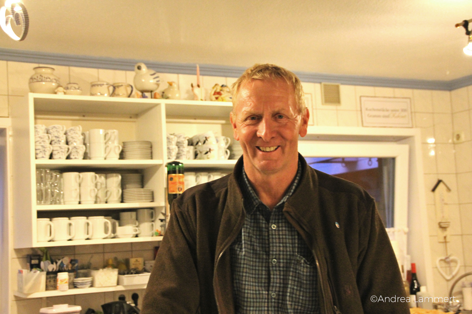 Wattführerin Regina Matthiesen steuert erstmal das kleine Gasthaus auf der Hallig an. „Essen Sie die Fischfrikadellen, die sind hausgemacht und sehr gut.“ Aber ich entdecke den friesischen Schafskäse auf selbstgebackenem Halligweißbrot – auch toll und genau das Richtige nach der Wanderung. Dabei fällt mir der Gastwirt auf, der mich aus so tiefen, klaren blauen Augen anschaut. Lebenslust, sehr viel Gelassenheit und Wohlwollen liegen in seinem Blick. Als er mit den Teller rüberreicht, frage ich ihn, ob er mir was zu seinem Leben auf der Hallig erzählen kann.