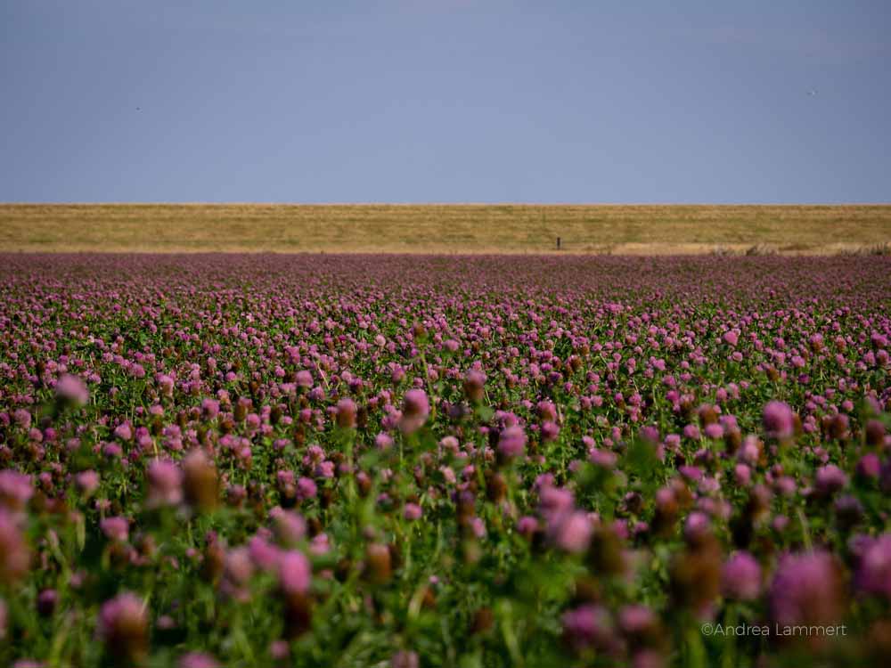 Ostfriesland im Spätsommer heißt für mich vor allem bunte Felder. Wer denkt, dass es nur im Frühling farbenfroh an der Nordseeküste zugeht, weil dann der Raps blüht, der täuscht sich gewaltig. Tatsächlich bietet Ostfriesland etwas viel Zarteres als die instagramfreundlichen Mohnfelder: Es gibt Felder mit Rotklee. Sie leuchten wunderschön in der Sonne in ihrem zarten Pink.