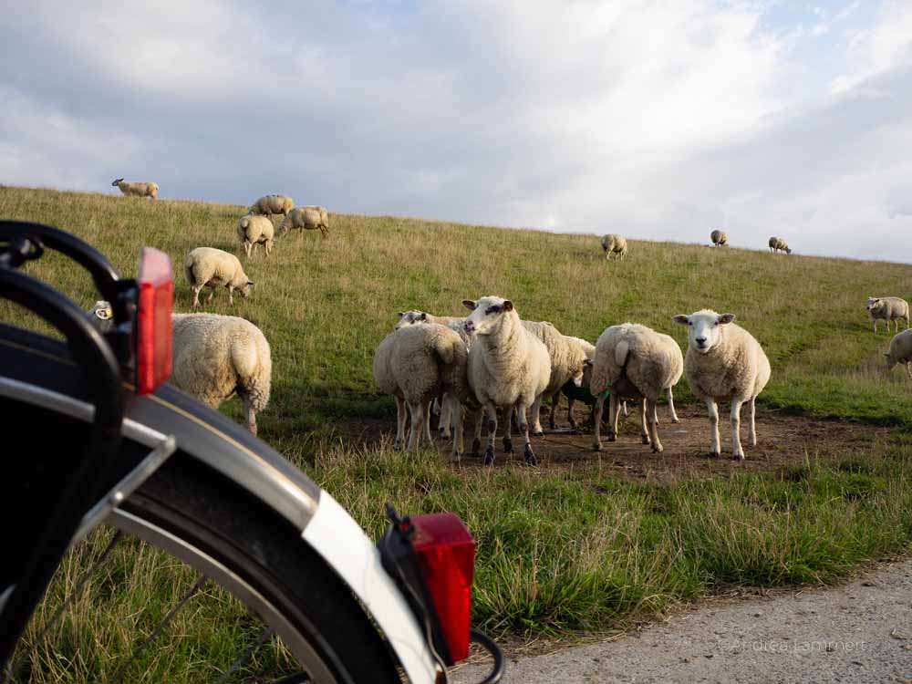 Damit eben das nicht passiert, lässt man die Schafe auf dem Deich weiden, denn sie halten nicht nur das Gras kurz, sondern trampeln auch den Boden schön fest – natürliche Deichpflege per Schaf an der Nordsee also. Und während die Schafe ihre Arbeit tut, lassen sie sich prima beobachten. Es lohnt sich, einfach mal mit dem Rad eine Tour entlang der Deiche zu machen, inne zu halten und einfach nur die Schafe zu beobachten. Es sind ganz schön witzige Tiere. Besonders niedlich ist es, wenn sie sich an Bänken oder Pfählen ausgiebig scheuern.
