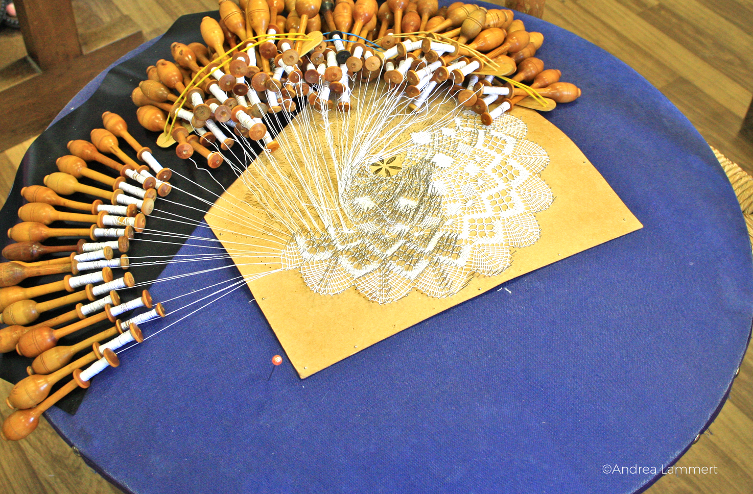 Flink werfen sie die Holzspulen von einer Seite zur anderen, um das Muster wenige Millimeter weiter zu ergänzen. „Es geht langsam voran“, sagt eine der Damen und zeigt stolz die kleine Blume, die sie hineingeflochten hat. „Für dieses Stück brauche ich eine Woche“, sagt sie und misst mit Daumen und Zeigefinger ein rund zehn Zentimeter langes Stück ab. Ihren Stundenlohn könnte man gar nicht bezahlen. Sie macht es aus Hobby und bewahrt damit eine ganz alte Handwerkskunst. Für mich ist es wie eine Reise in eine andere Vergangengheit. Meine Oma hat soetwas Ähnliches auch gemacht…