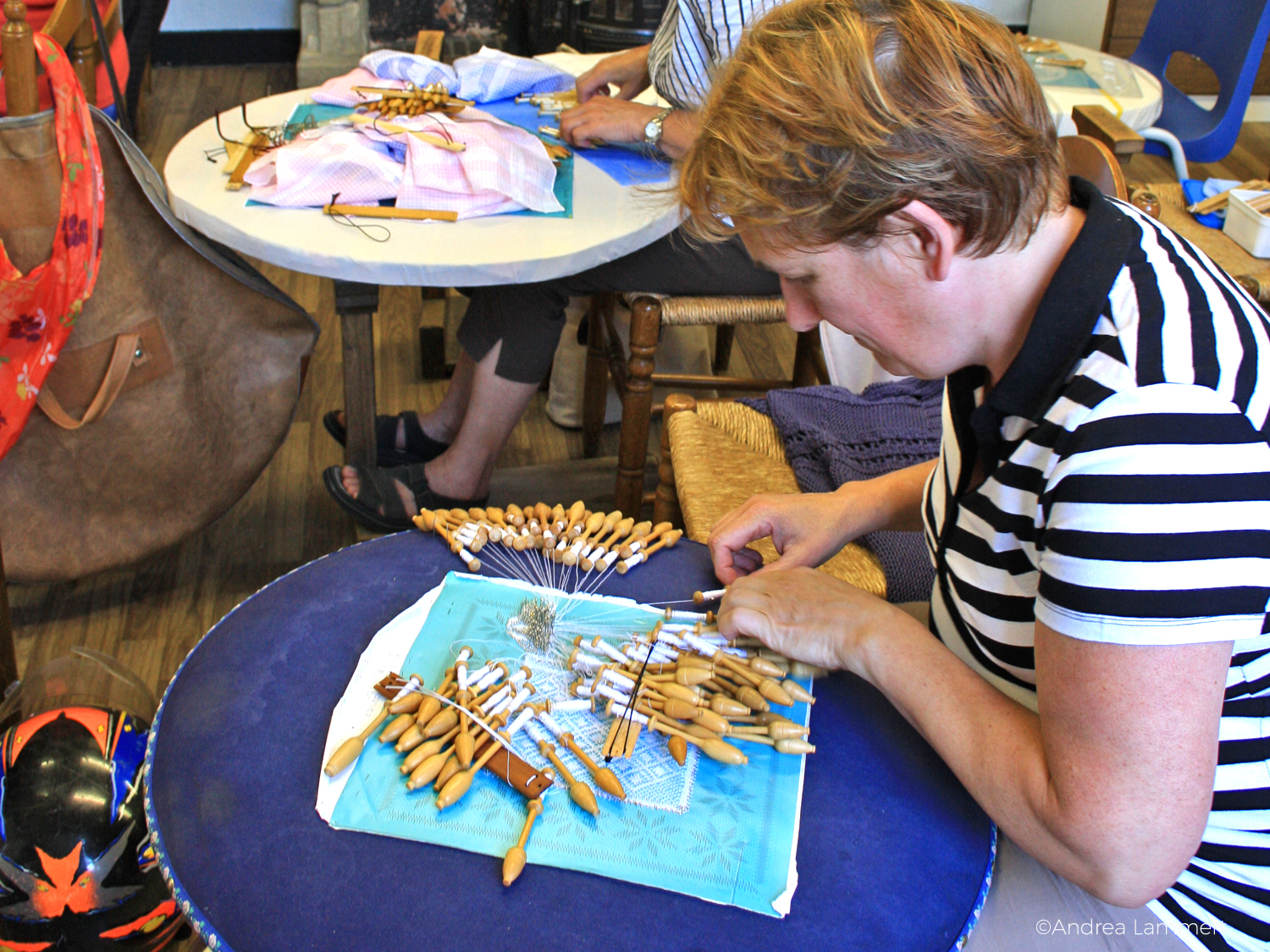Ein kleiner Gang neben der Kirche führt in einen unscheinbaren Innenhof. Blaue Holzfenster an einem langen, grauen Backsteingebäude wirken sehr privat. Im Spitzenzentrum sitzen weißhaarige Frauen konzentriert gebeugt über einem Gewirr von Fäden und Spulen. Bis zu 100 Klöppel führen sie in gekonnter Raffinesse um dünne Nägel herum, die als Halterungen für den Faden auf ein stoffbespanntes Brett geheftet sind.